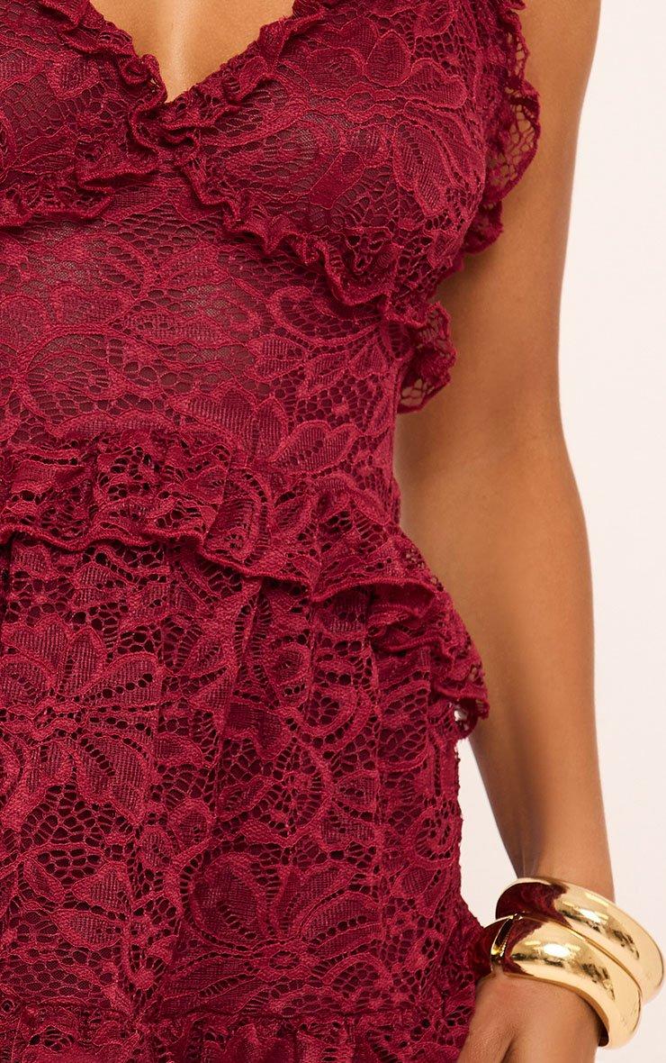 Plunge Neck Frilled Detail Floaty Mini Dress In Burgundy Lace