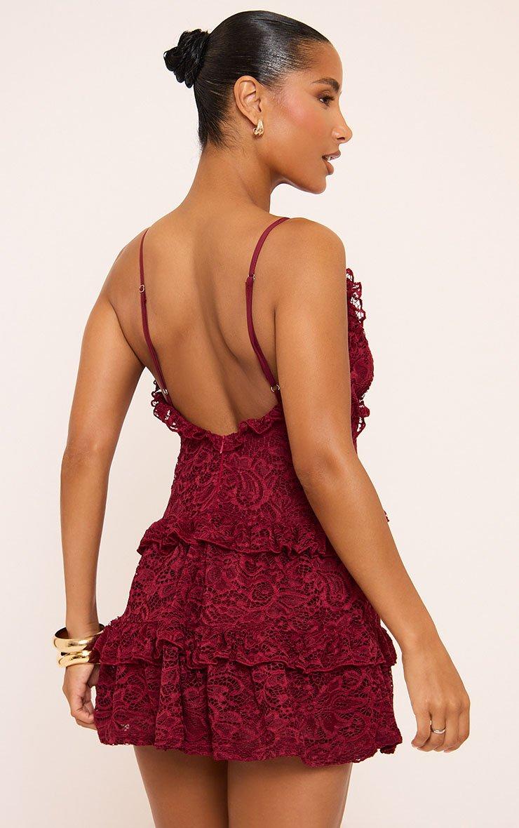 Made for bold nights and luxe vibes, featuring burgundy lace with plunge neck, frilled, and floaty mini dress detailing—this dress serves fresh, chic energy with a dramatic edge, doll. Turn up the heat and slay.