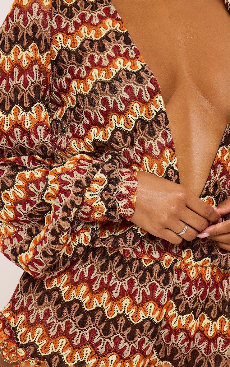 Long Sleeve Plunge Neck Frilled Hem Playsuit In Multi Print Crochet