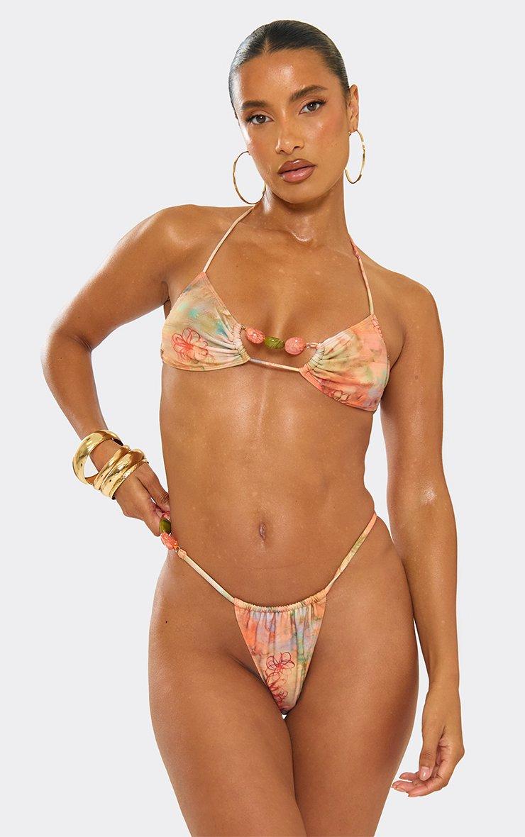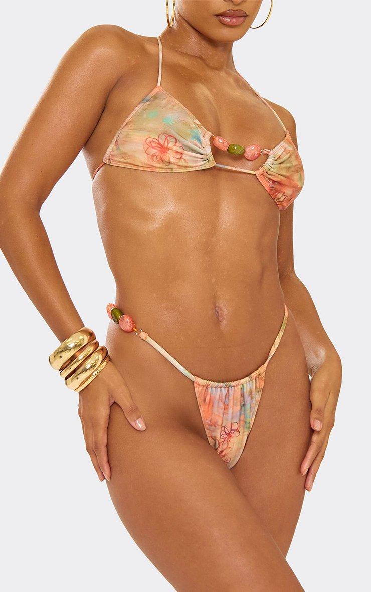 Chunky Beaded Detail Bikini Set In Multi Abstract Print