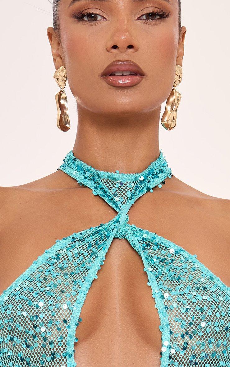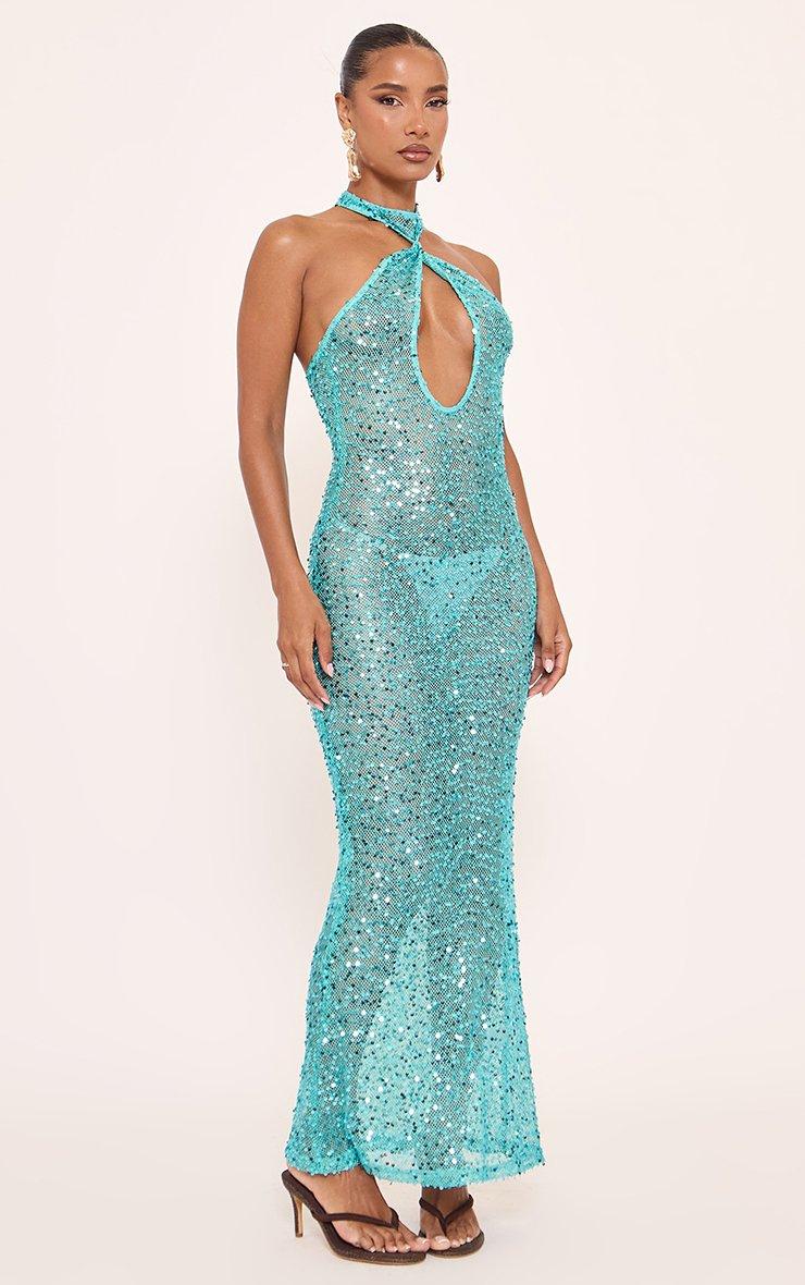 Halterneck Keyhole Cut Out Maxi Dress In Blue Sequin Fishnet