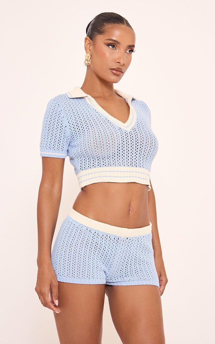 Mid waist contrast micro shorts in blue crochet knit, featuring intricate detailing for a chic, standout look that's effortlessly stylish and cool.