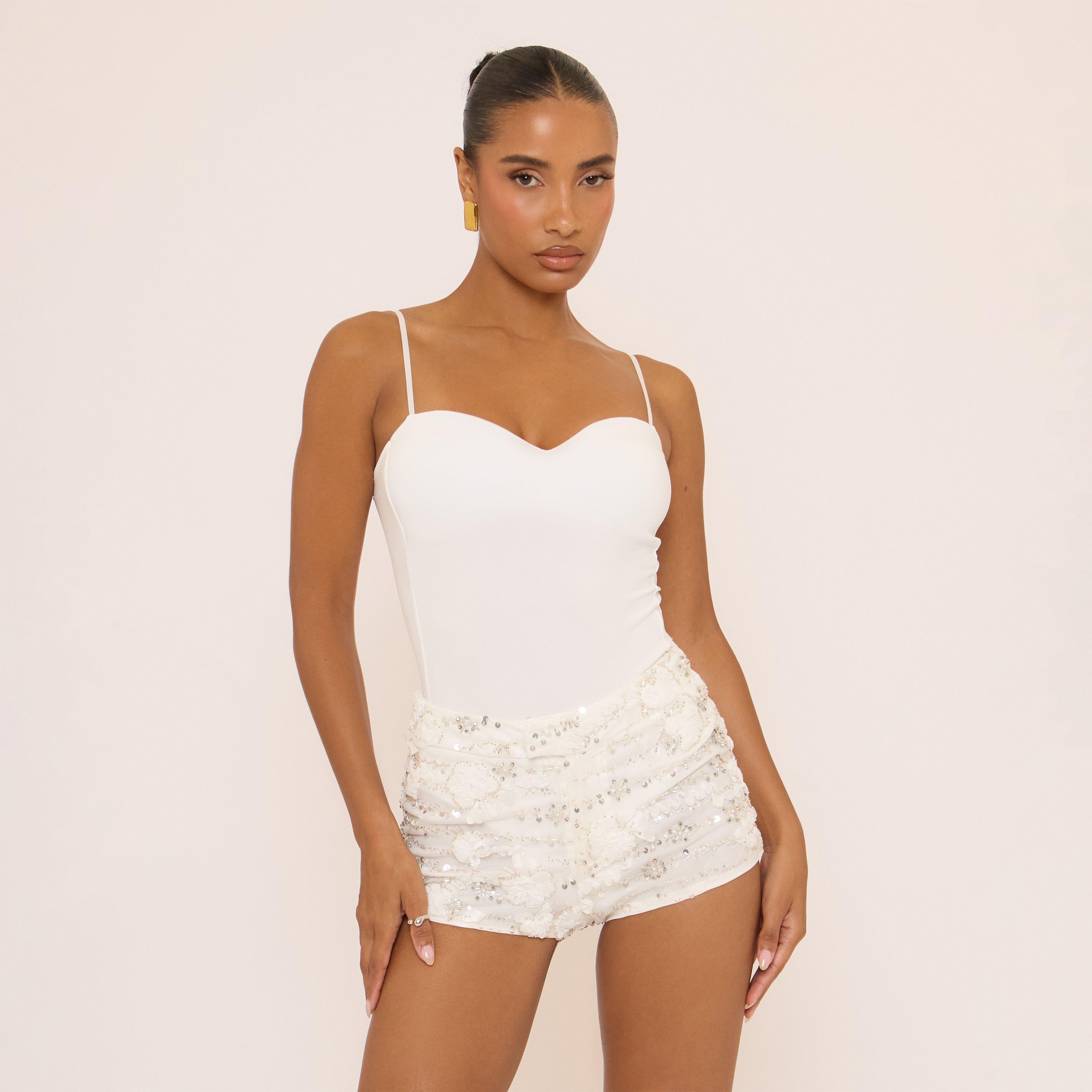 White tailored shorts detailed with sparkling embellishments, designed with a low rise for a chic, polished look.