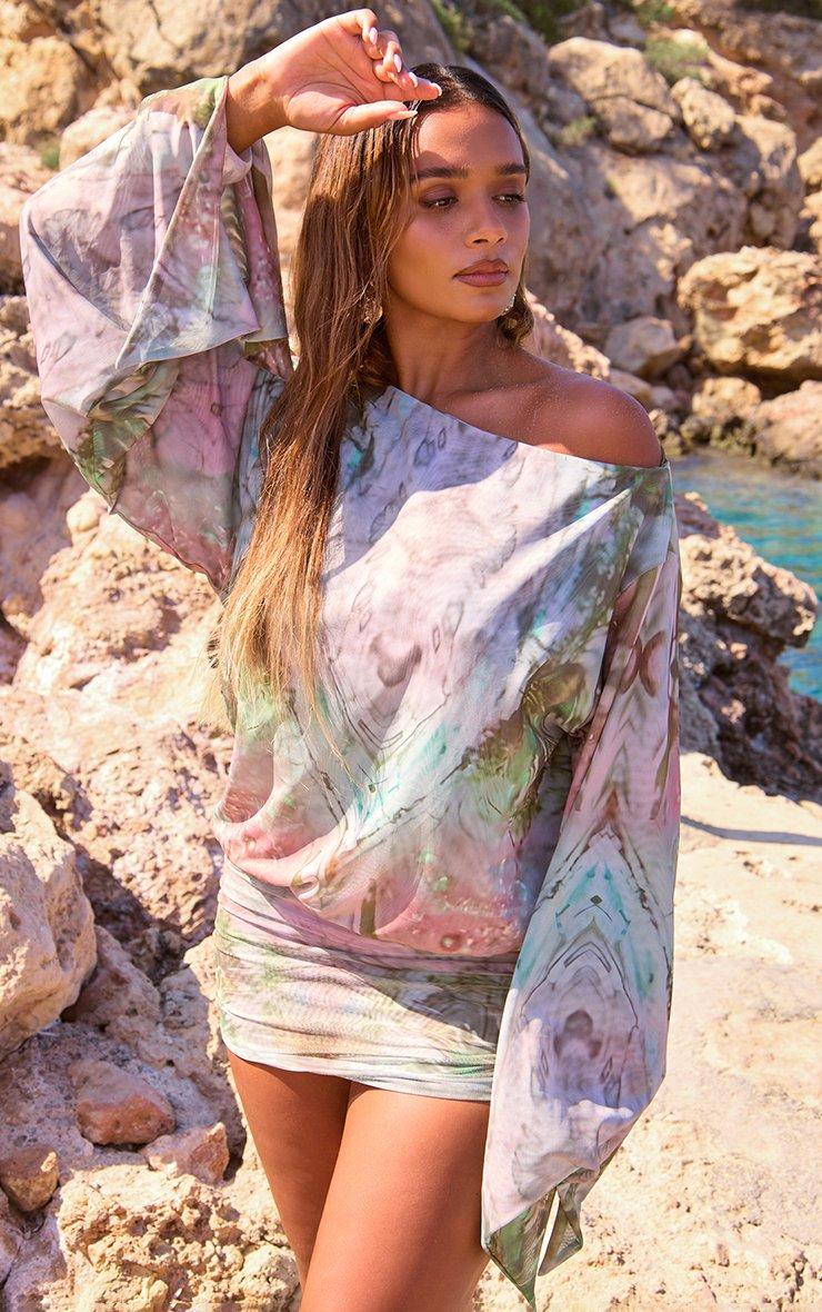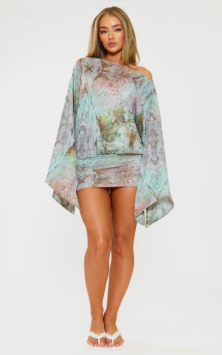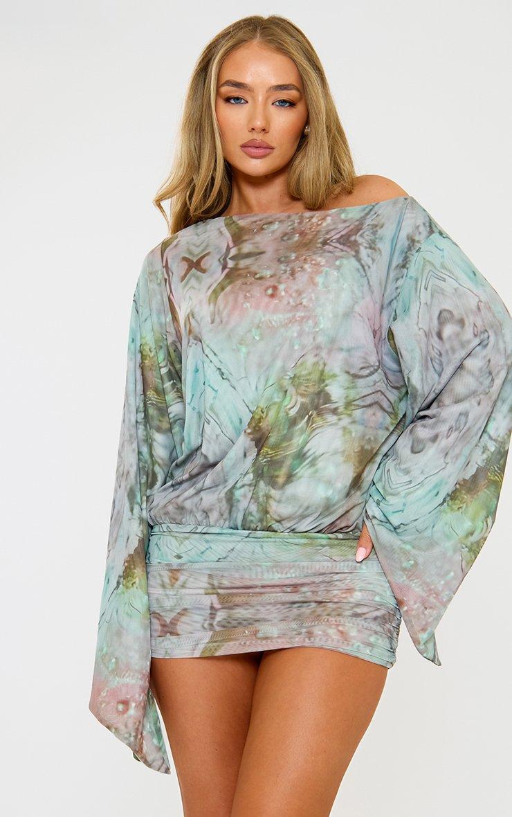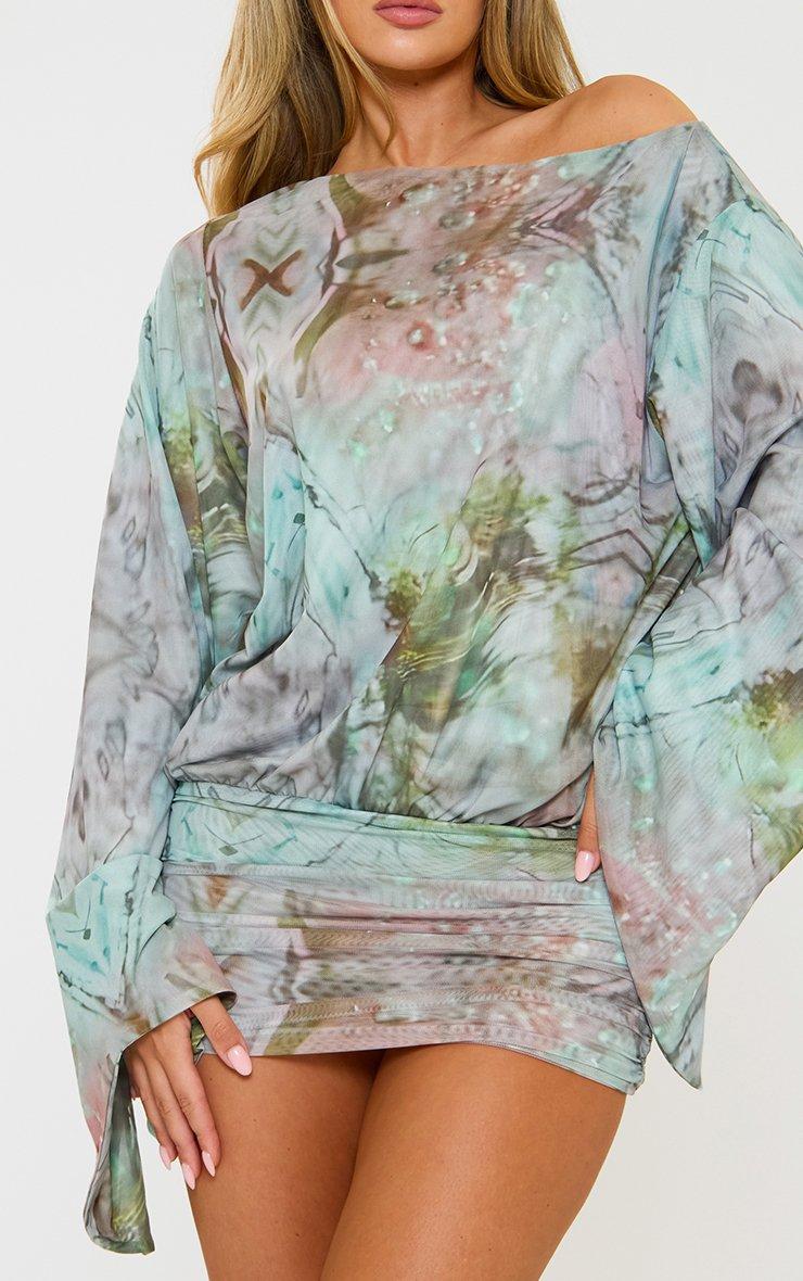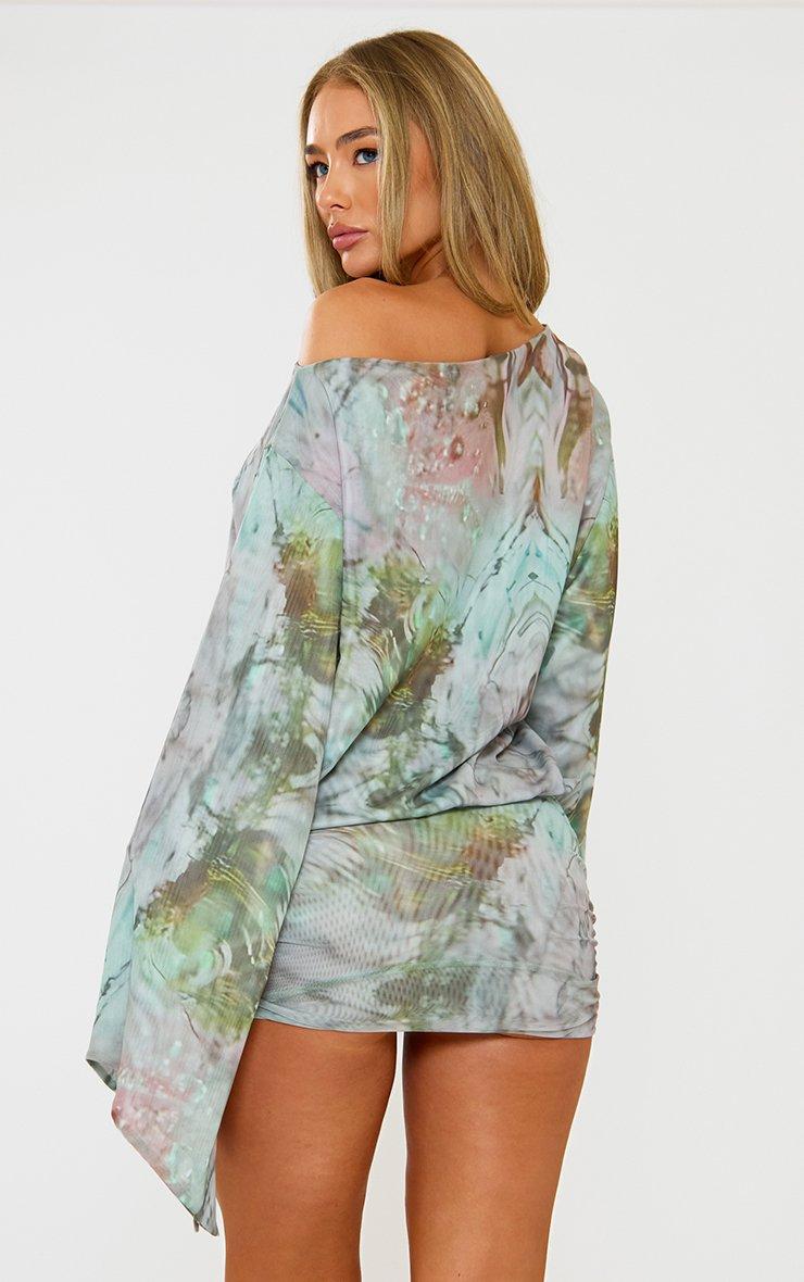 Long Sleeve Ruched Asymmetric Mini Dress In Multi Print