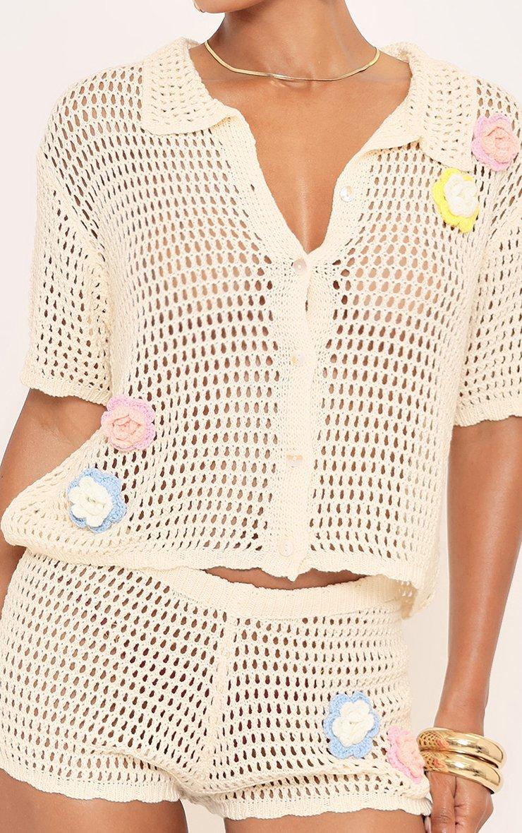 Multi Floral Applique Shorts In Cream Crochet Knit