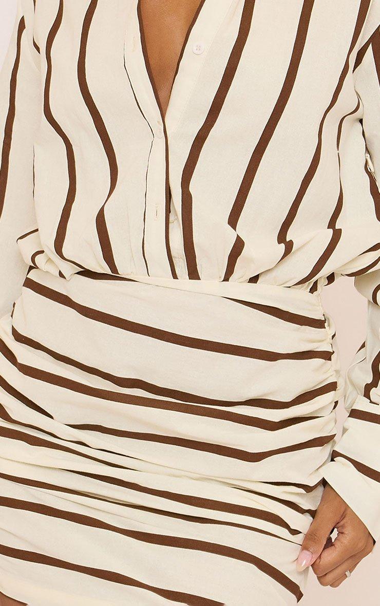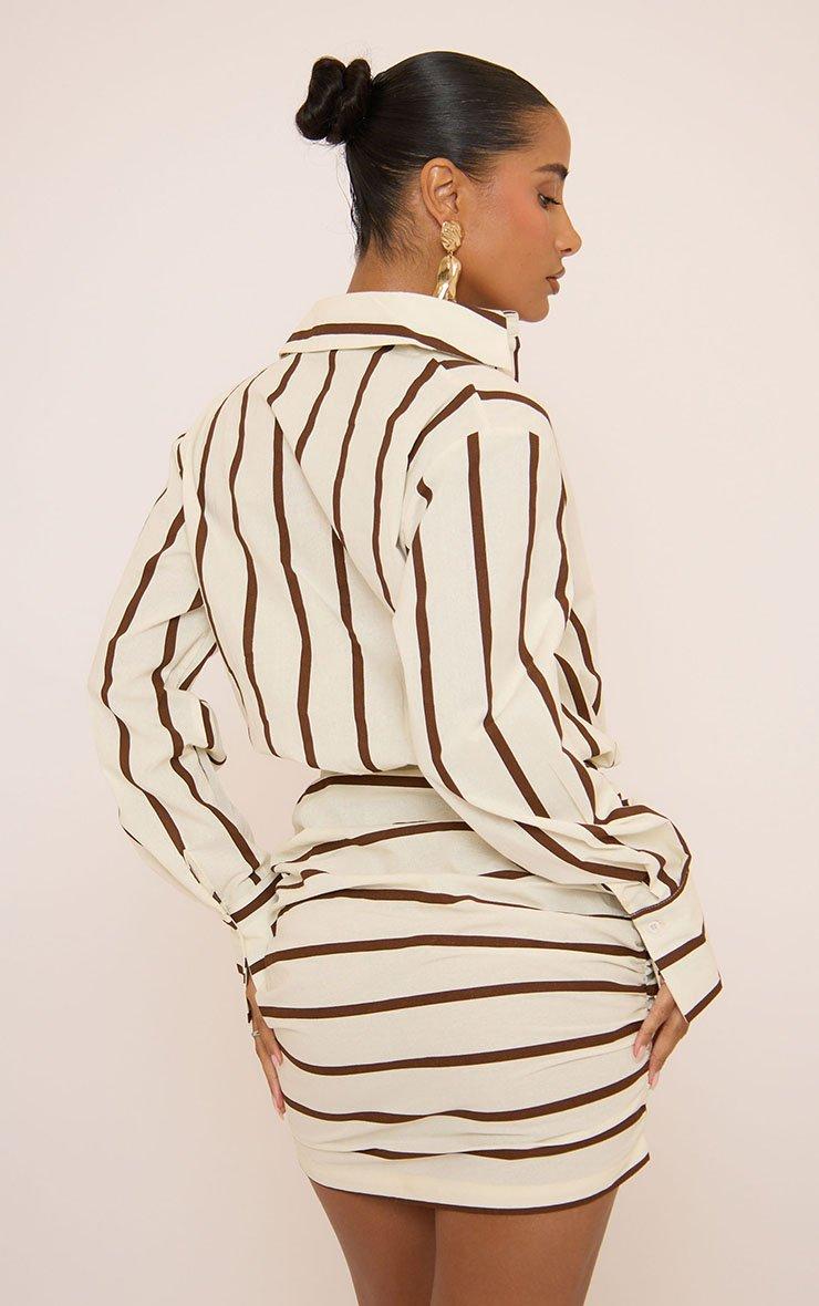 Perfect for spring days, featuring a crisp white linen material with subtle stripe detailing. This long sleeve shirt dress brings effortless chic with its clean lines and breezy texture, doll.