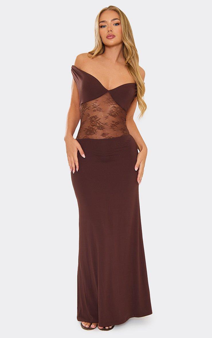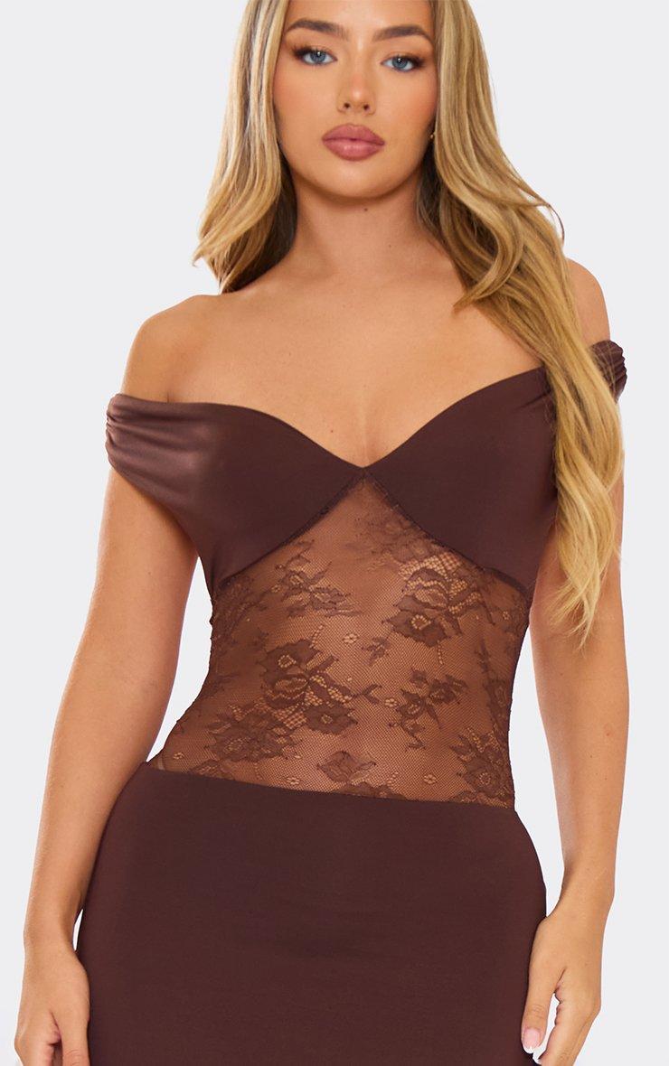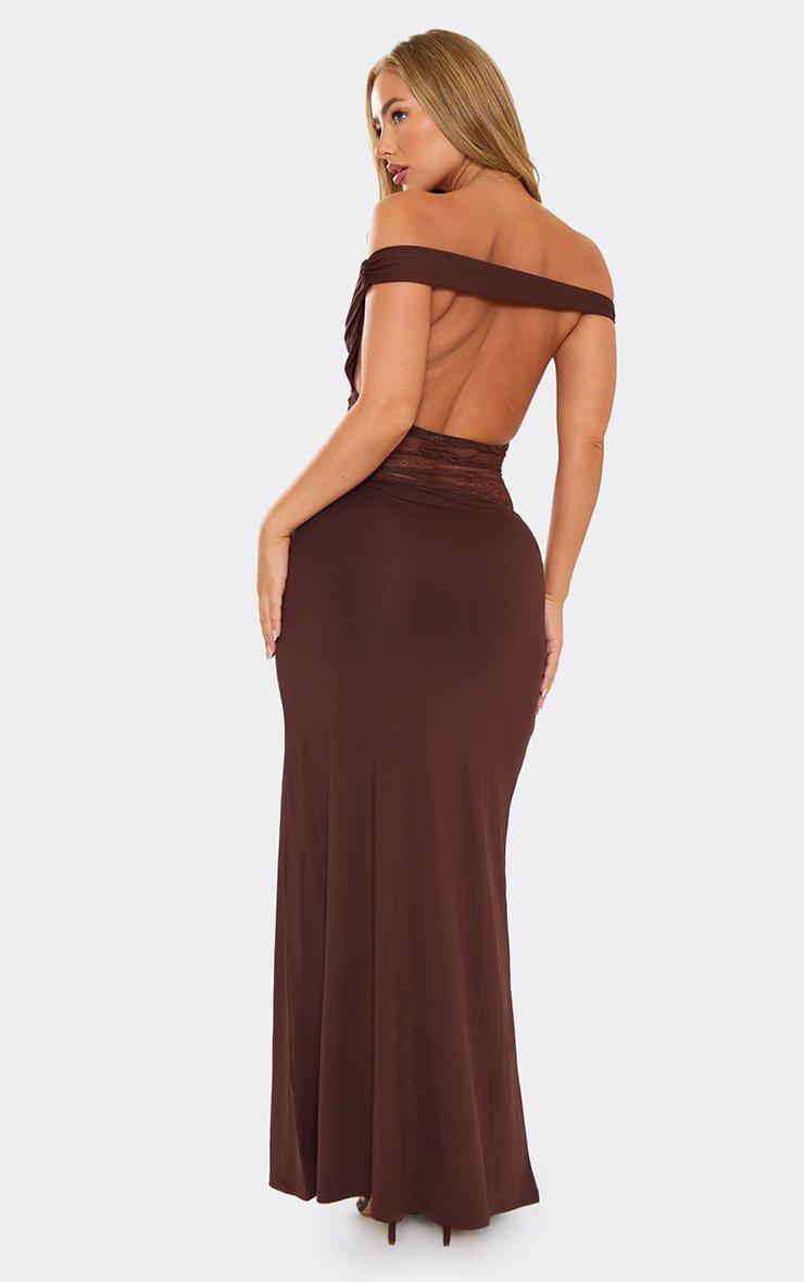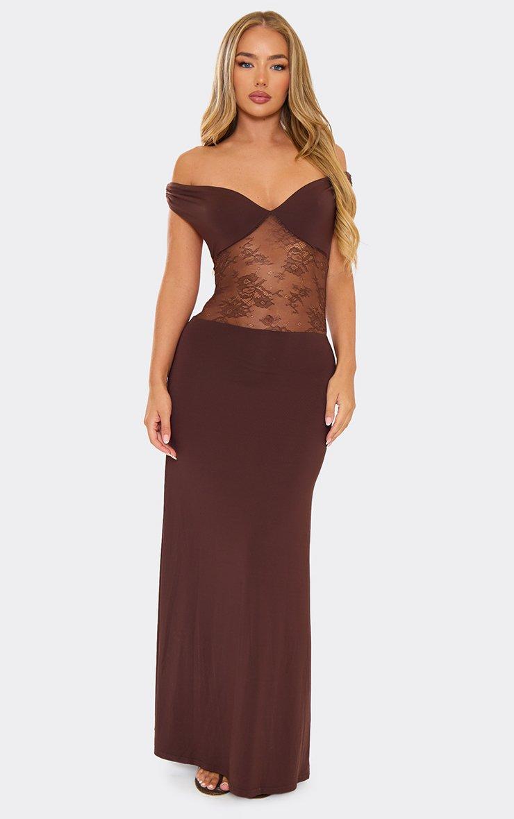 Off The Shoulder Contrast Lace Panel Maxi Dress In Brown