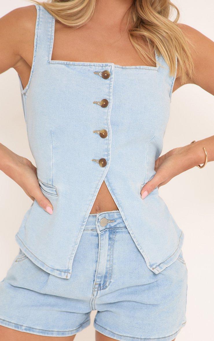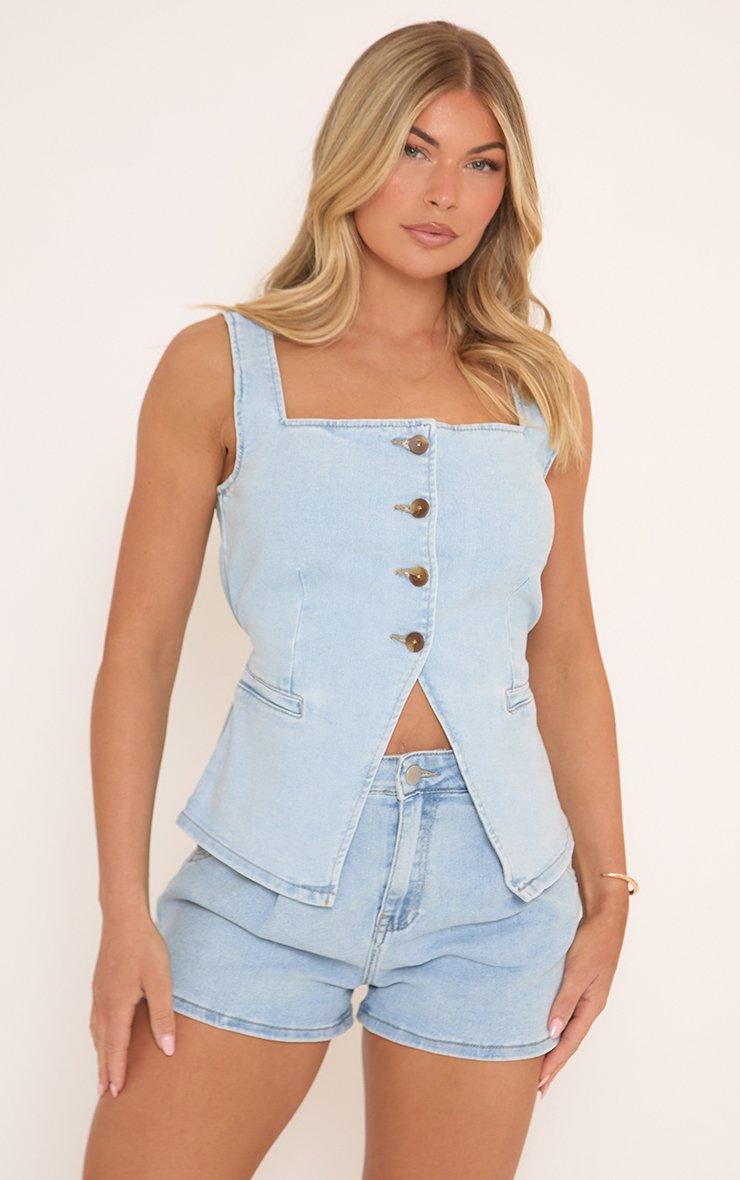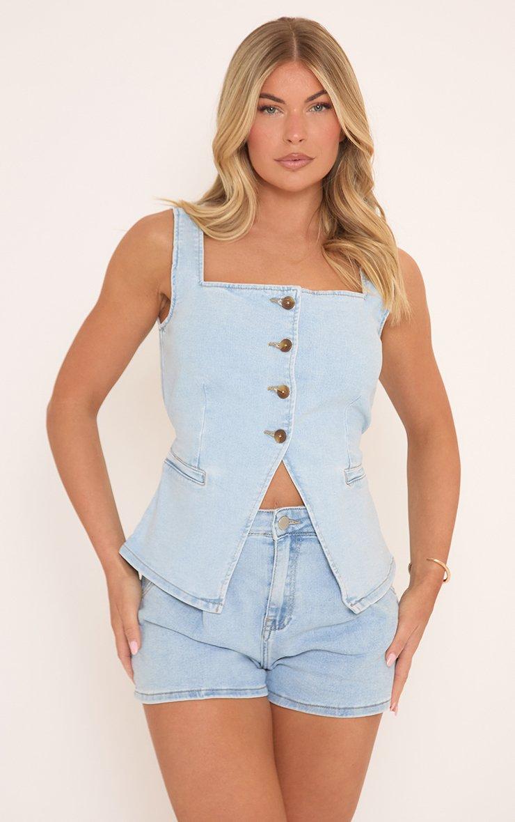 Serve serious style, doll! This blue denim square neck waistcoat with button front detailing is giving cool, structured vibes with a fresh, edgy twist—perfect for taking your look next level.