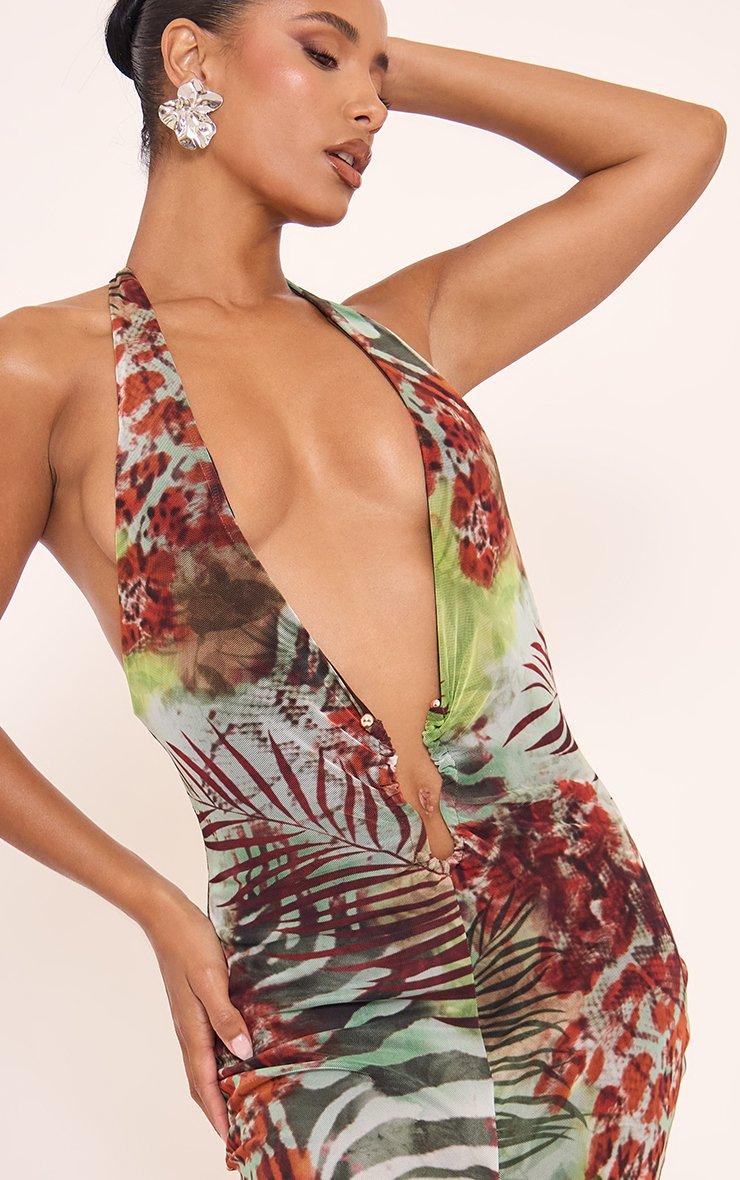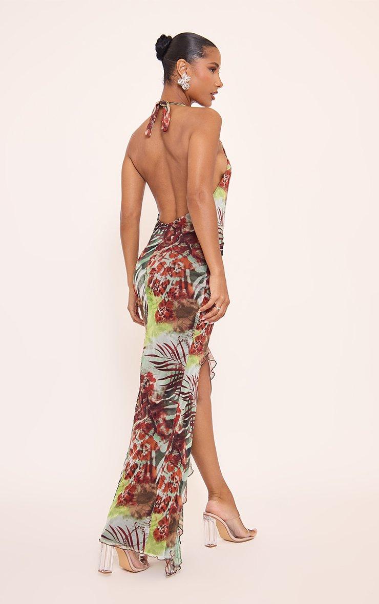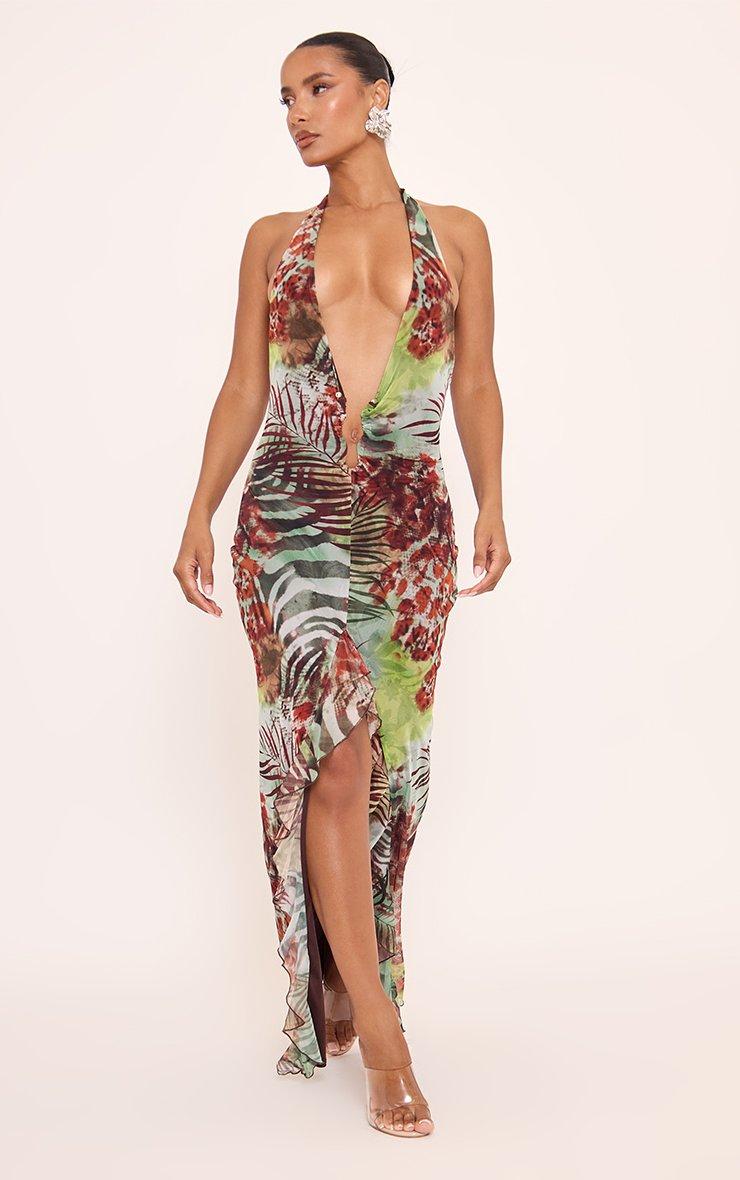 Make a fierce statement, doll! Featuring a multi animal print with plunge halterneck, trim detail, split leg, and frill hem, this maxi dress is pure wild chic—perfect for turning heads day or night!