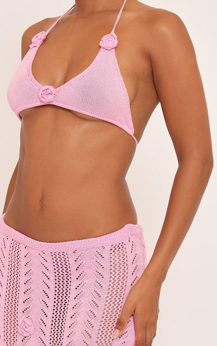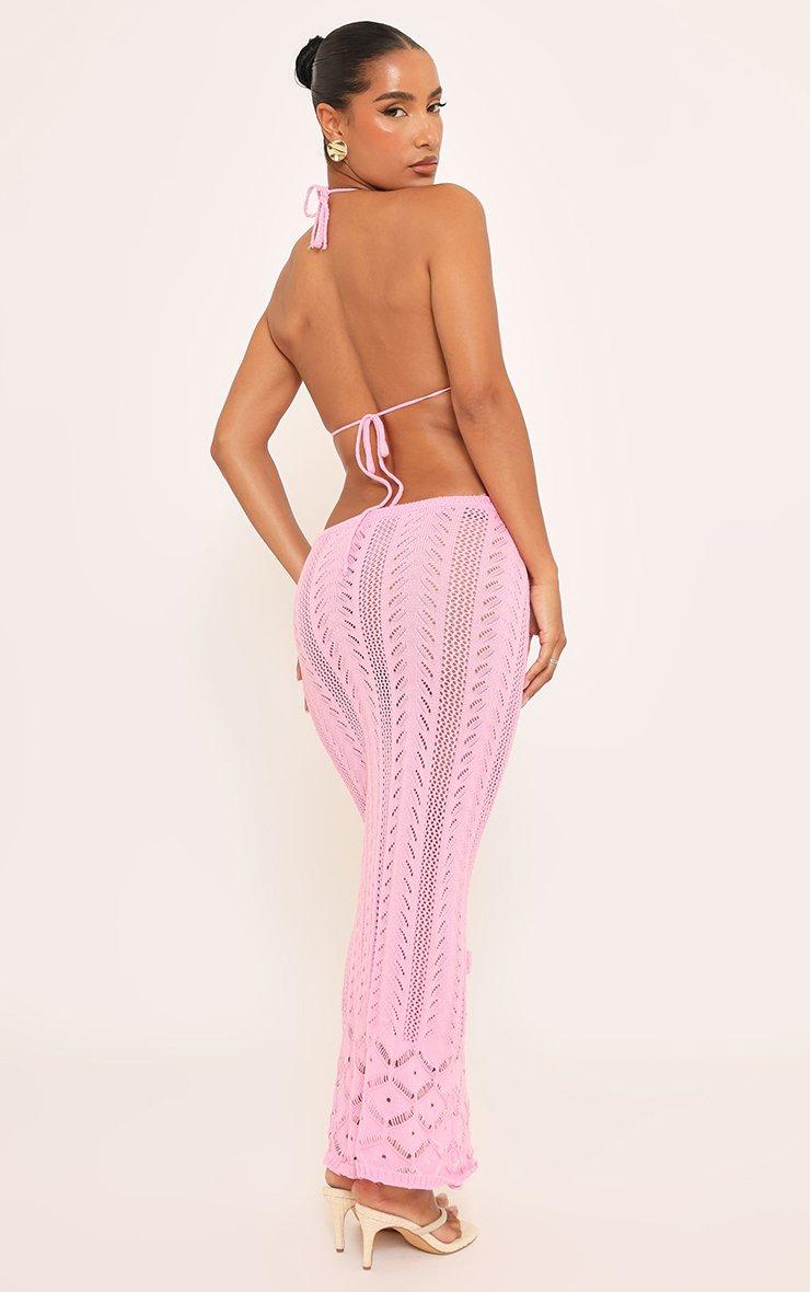 Strappy Floral Applique Detail Bralet Top And Maxi Skirt Co-Ord Set In Pink Crochet Knit