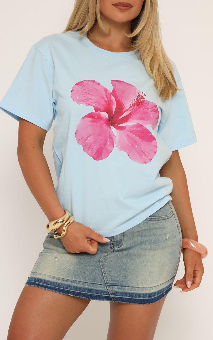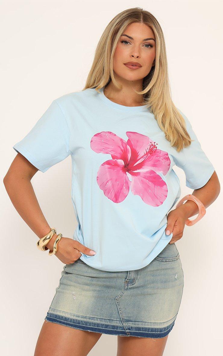Keep it cool and casual. Featuring a blue soft cotton material with floral print detailing in an oversized fit, this t-shirt is your go-to for easy style with a playful edge.