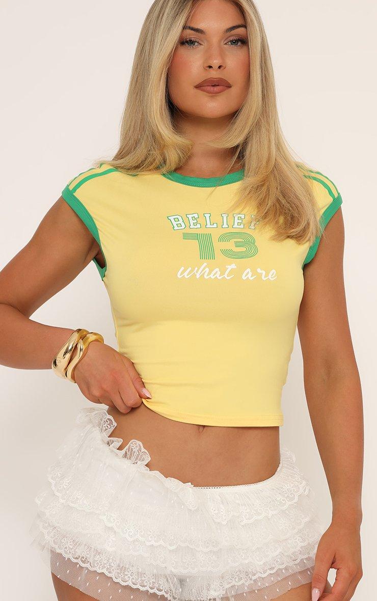 Add some attitude to your everyday look. Featuring a yellow soft stretch material with contrast trim and printed detailing in a cropped baby tee fit, this top is serving retro vibes with a fresh twist.