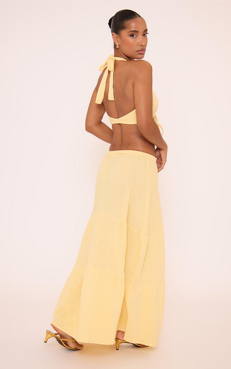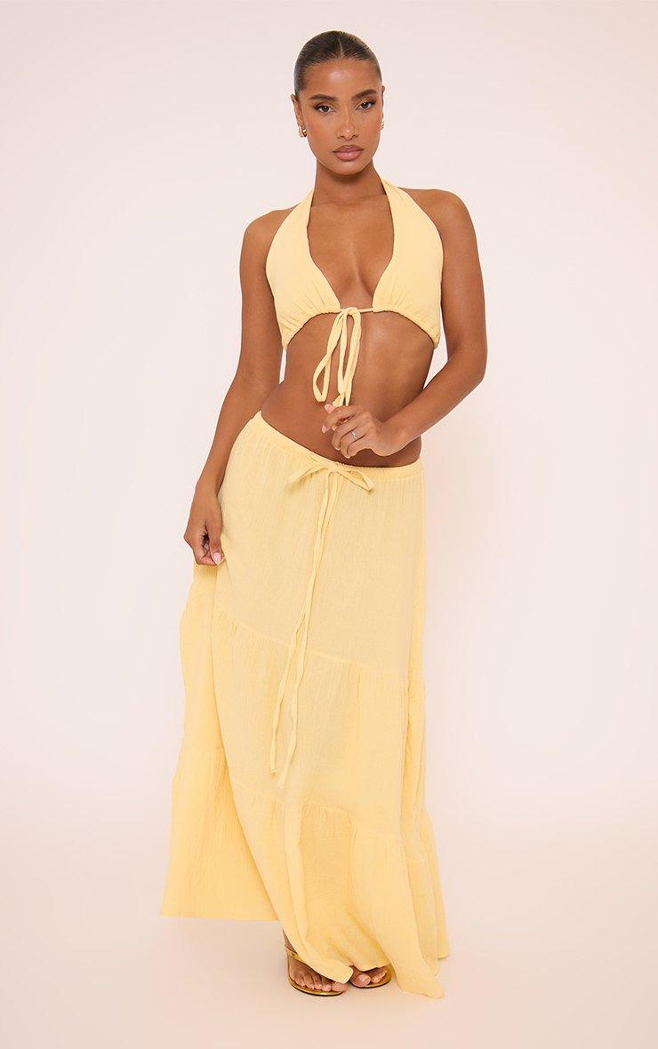 Mid Rise Tie Front Tiered Maxi Skirt In Yellow