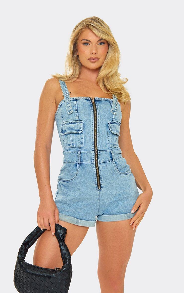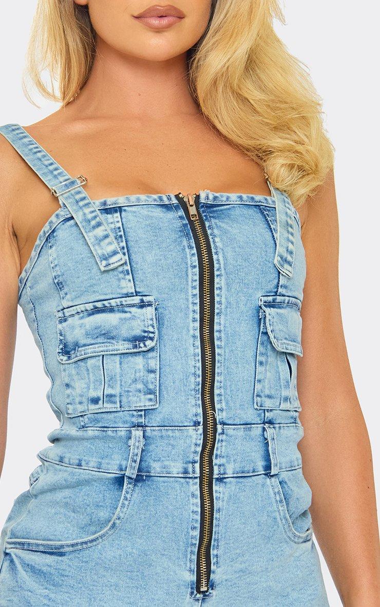 Square Neck Pocket Zip Front Fitted Playsuit In Washed Blue Denim