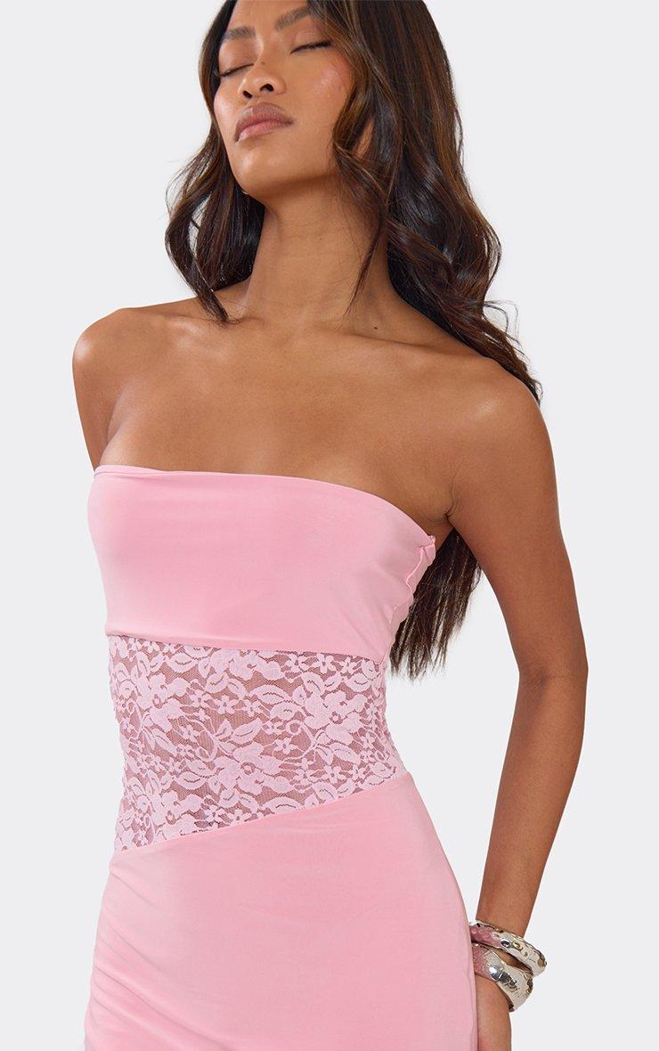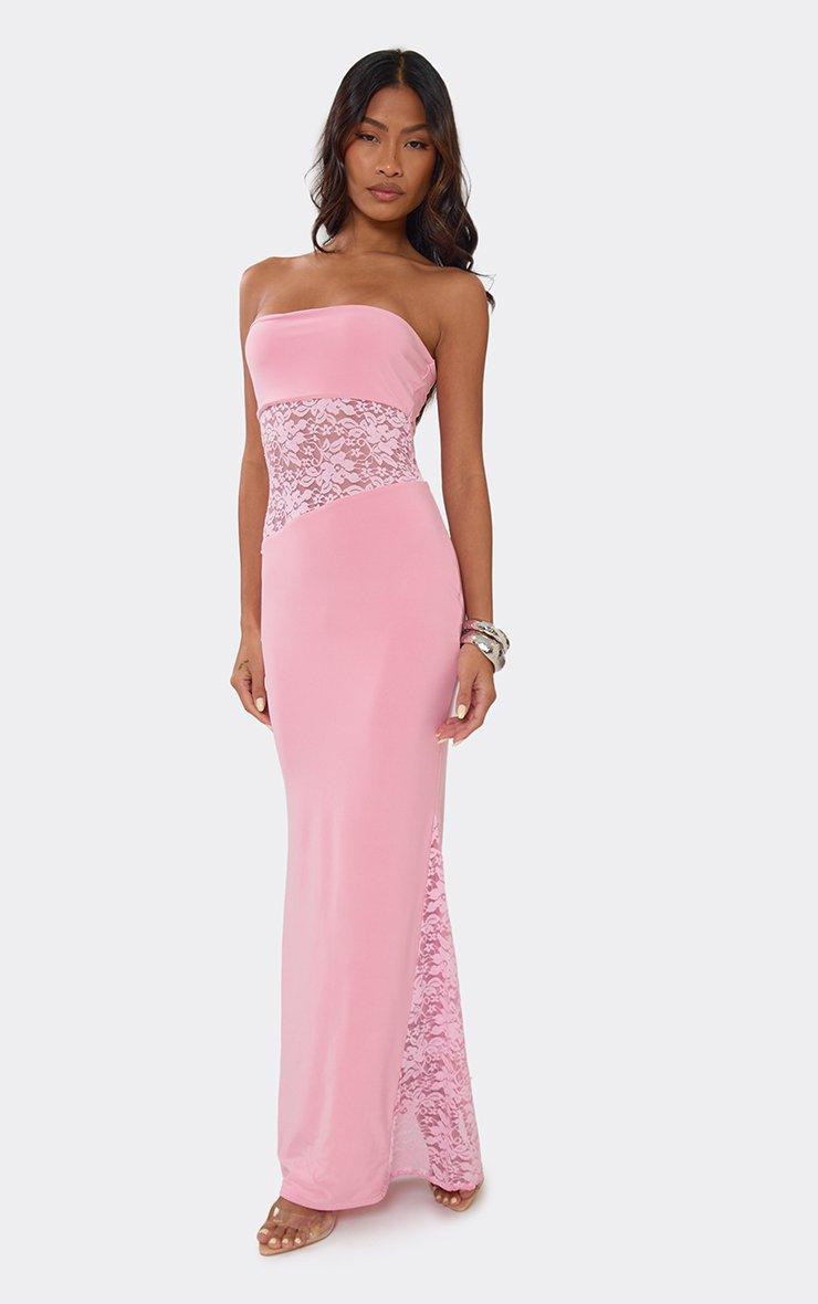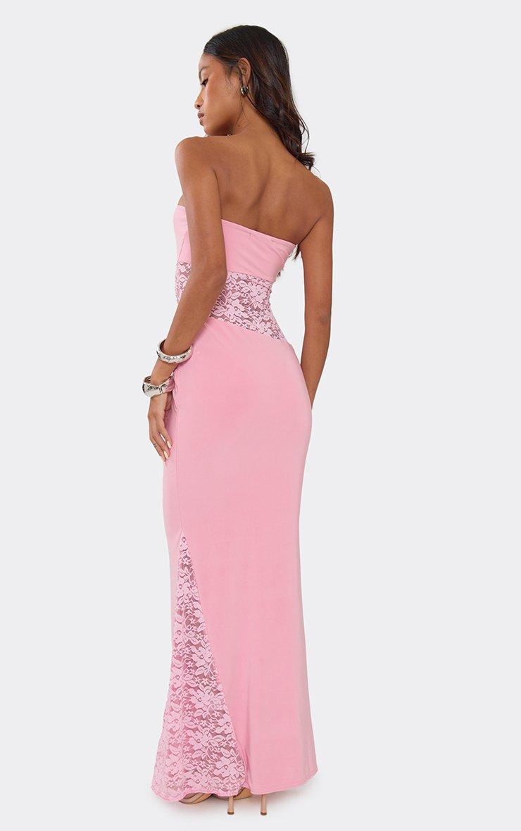 Make an entrance in pink material featuring a bandeau neckline, contrast lace, and cut-out detailing. This sharp, high-octane maxi dress delivers a total "glamour-core" aesthetic for a major it-girl finish. Style with strappy heels and silver jewelry for a polished vibe.