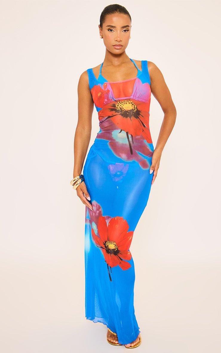 Sleeveless Scoop Neck Detail Beach Maxi Dress In Blue Floral Print Mesh