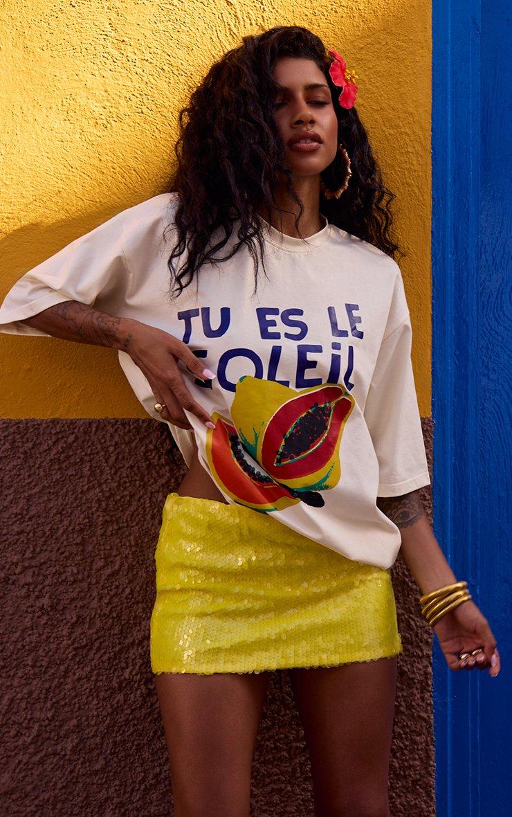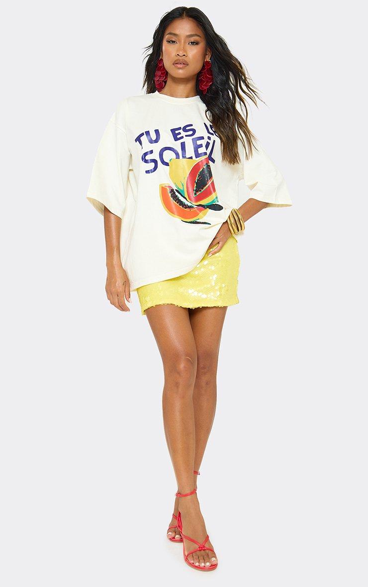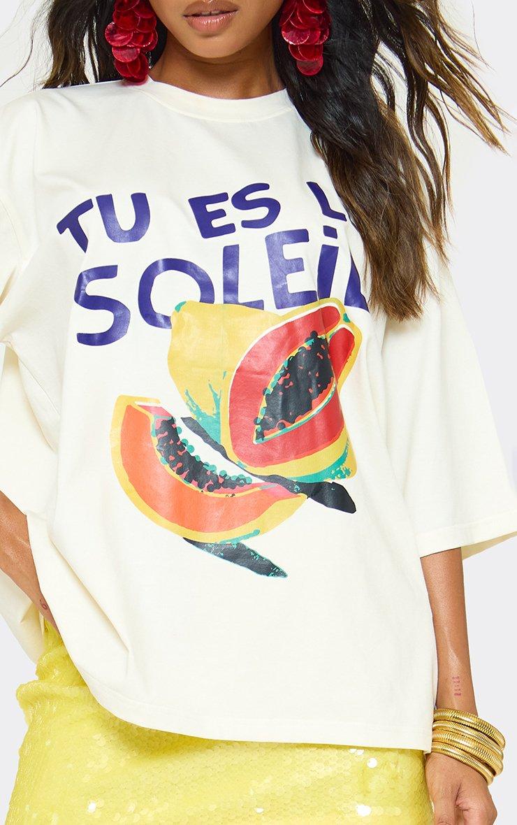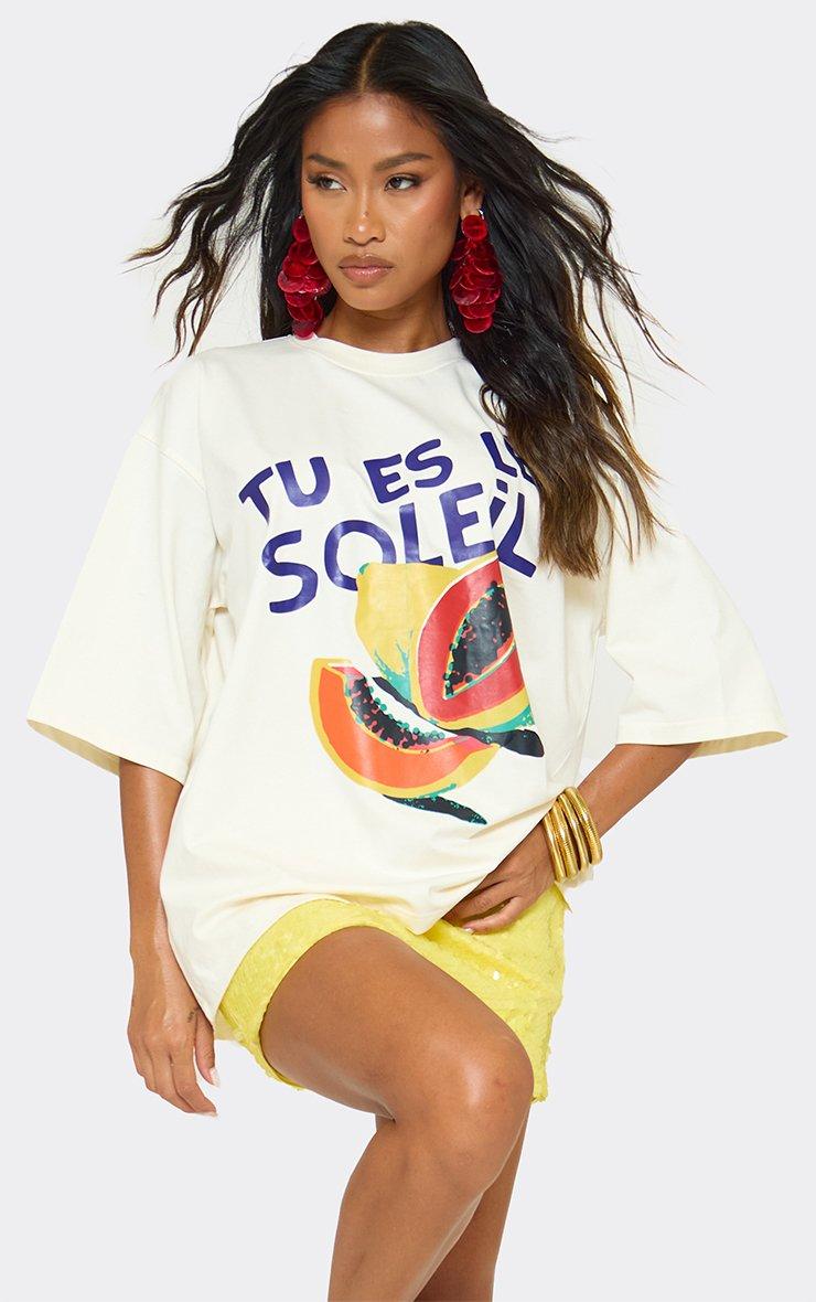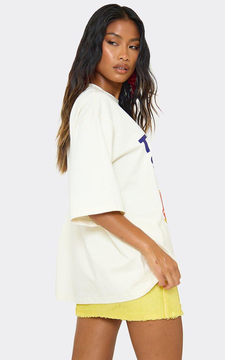 Short Sleeve Graphic Print Detail Oversized Boxy Tee In Cream