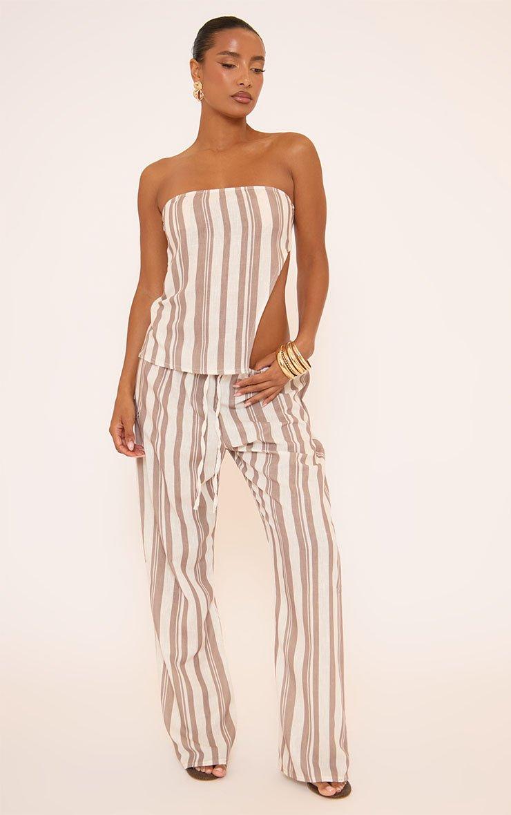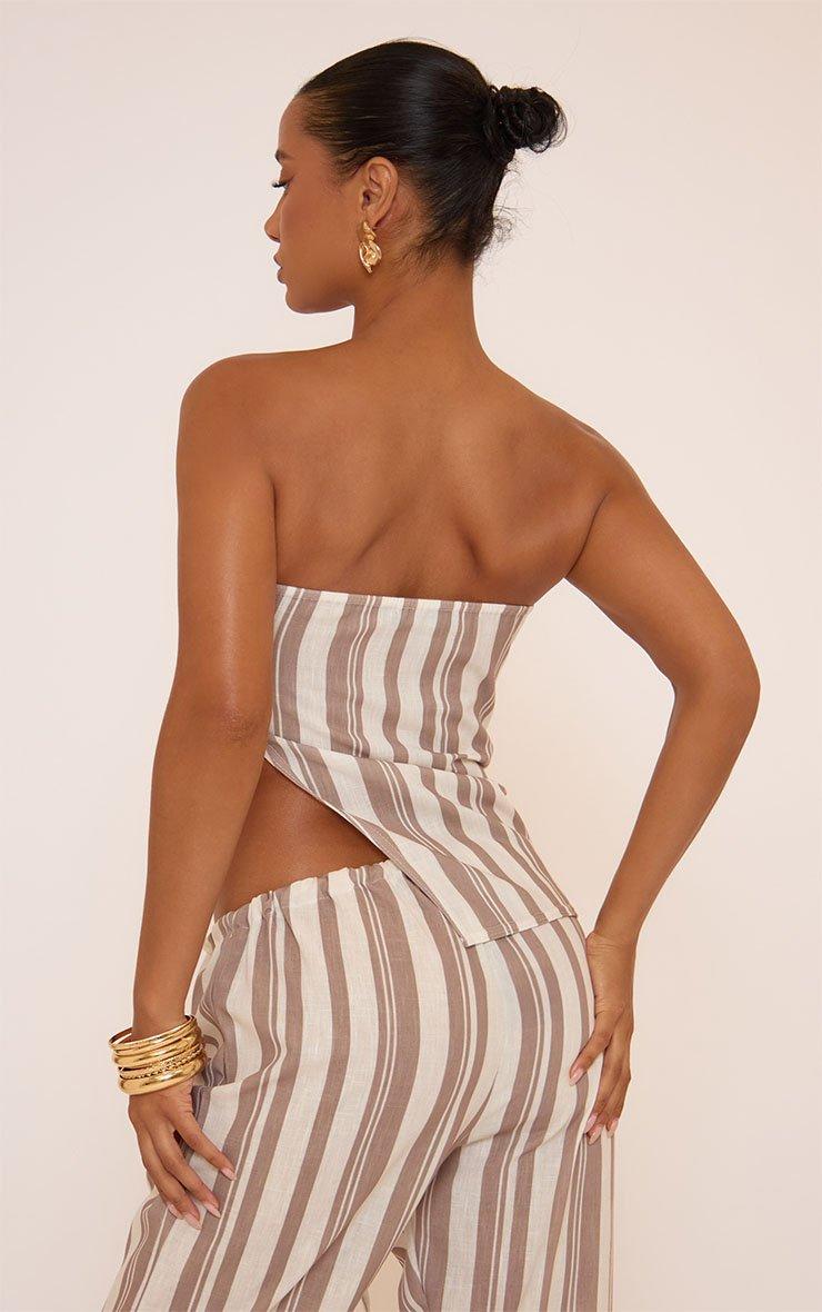 Bandeau Long Split Hem Top In Brown Stripe Linen