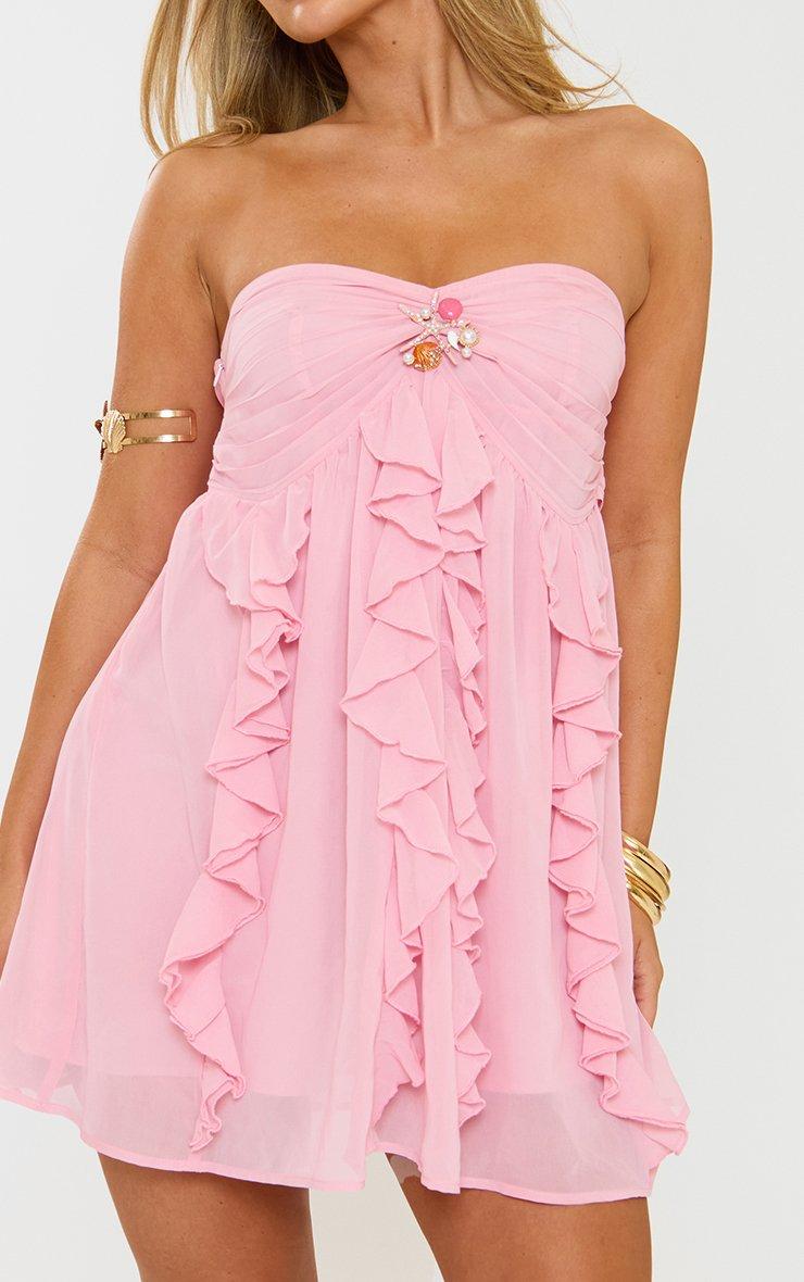 Bandeau Draped Frill Front Pearl Trim Mini Dress In Pink