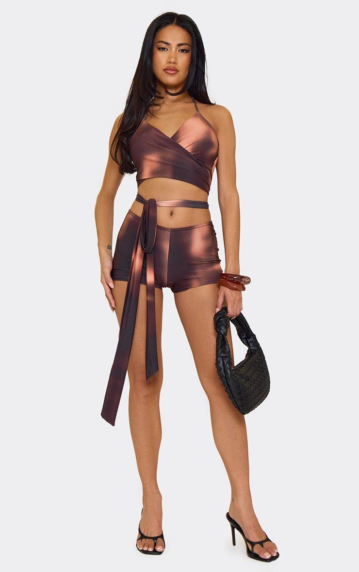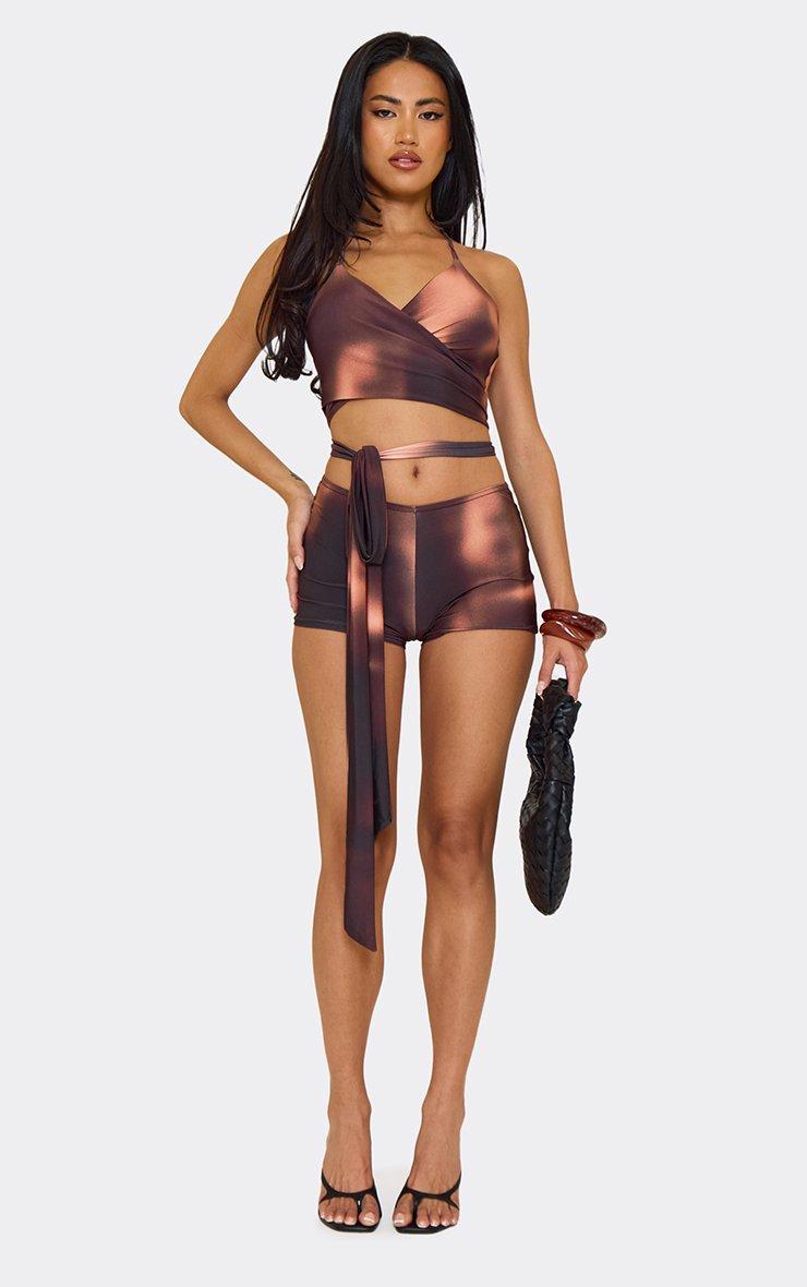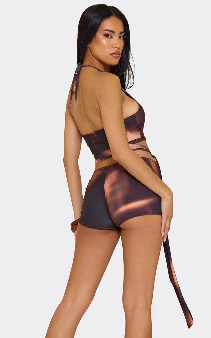 Turn up your summer style, doll! Featuring brown printed slinky fabric, these mid-rise hot pants dazzle with sleek detailing for a chic, bold finish packed with attitude.