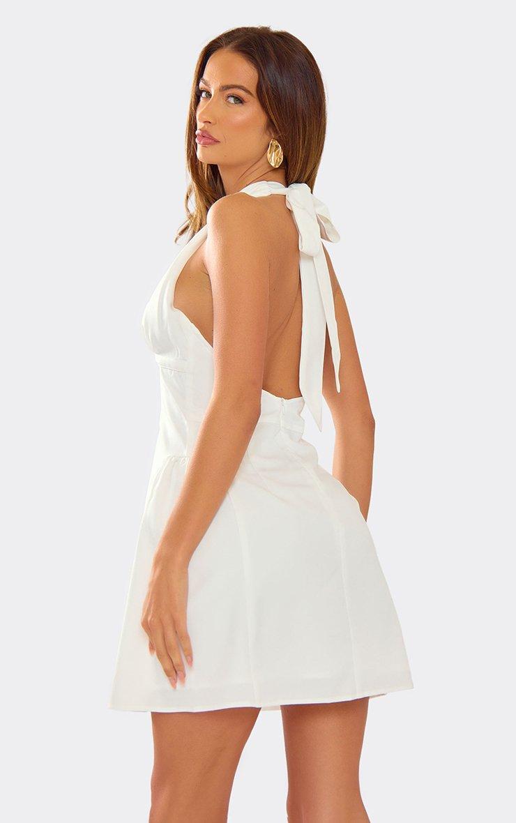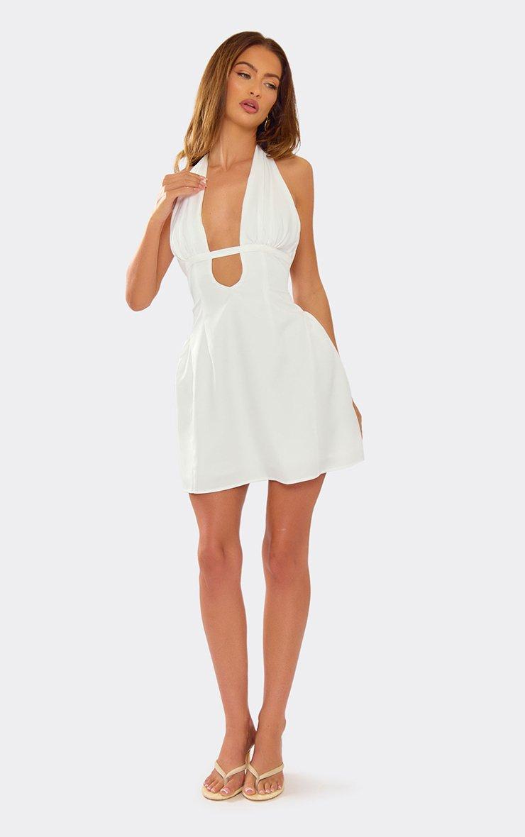 Plunge Neck Pleated Bust Detail A Line Mini Dress In White