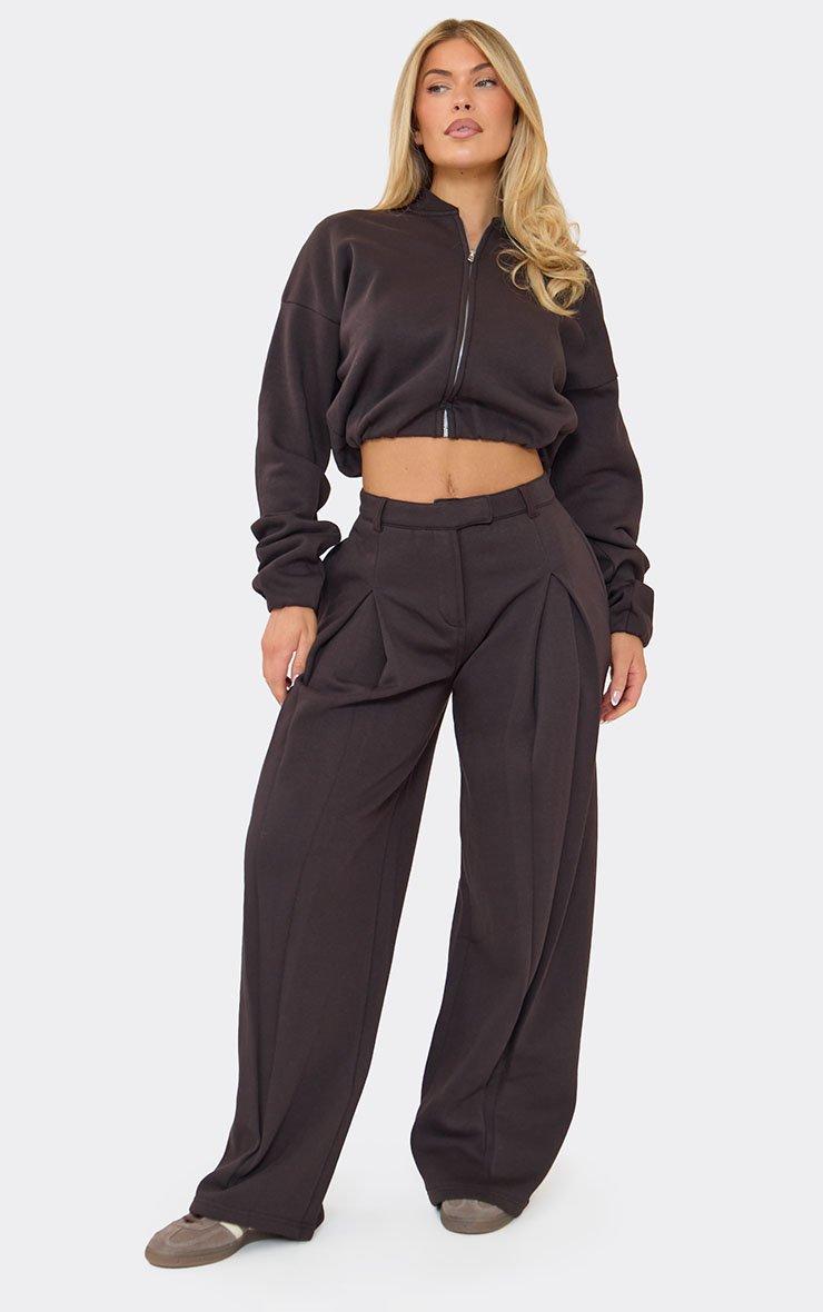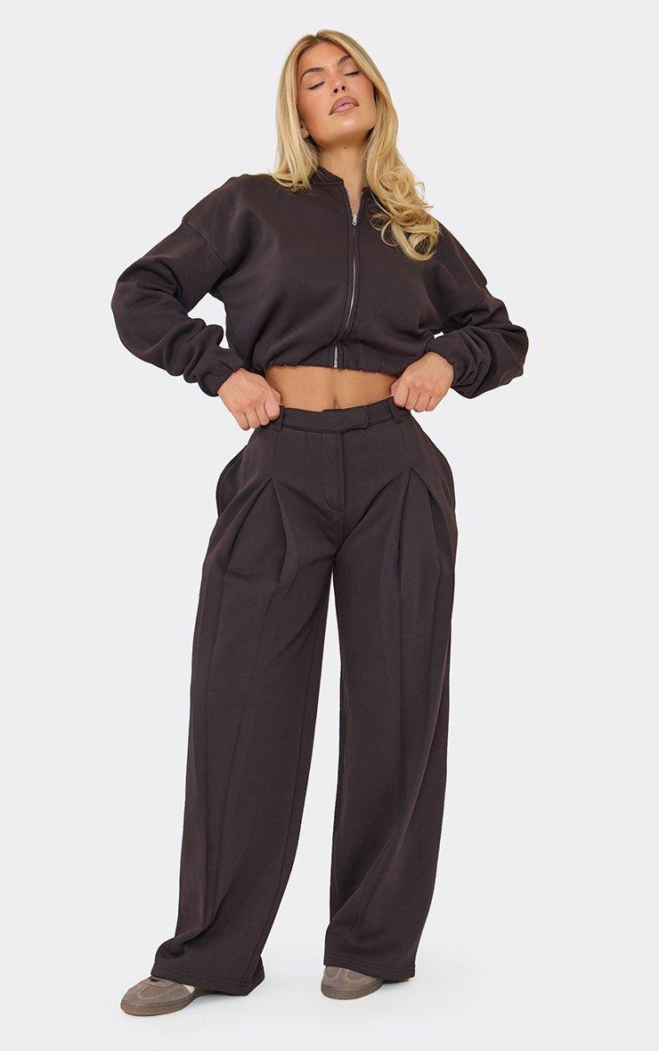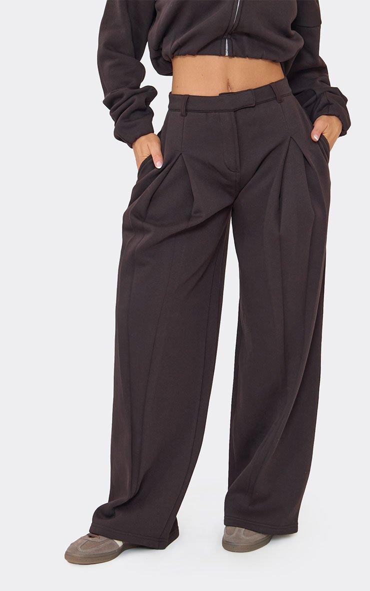 These pleated wide leg joggers bring a shift to everyday loungewear, combining tailored details with all-day comfort. Featuring subtle pleat-front detailing and a flattering mid-rise waist, these pleated wide leg joggers elevate relaxed dressing while remaining easy to wear. Ideal for creating chic comfy airport outfits, they style effortlessly with fitted tops , cropped sweatshirts or lightweight knits when choosing what to wear with joggers. The chocolate brown shade adds warmth and sophistication to your casual rotation. Key Features Chocolate Brown Colour Pleated Front Detail Tailored Design Mid-Rise Waist Wide Leg Fit