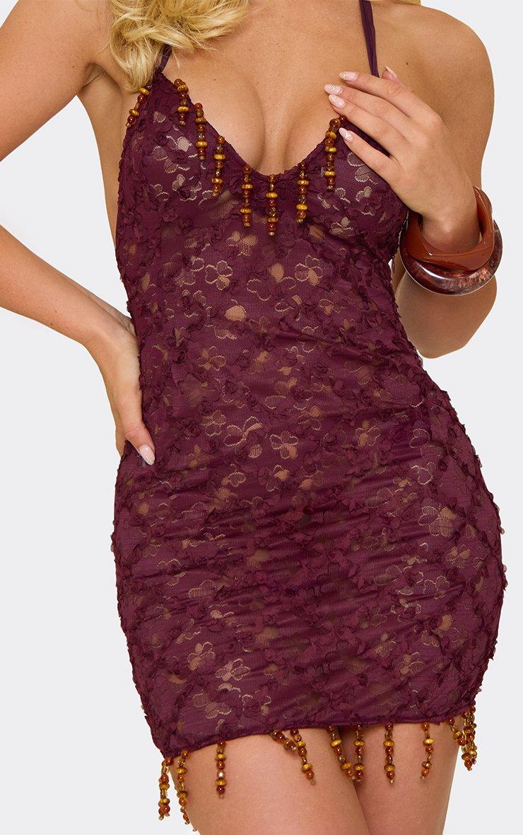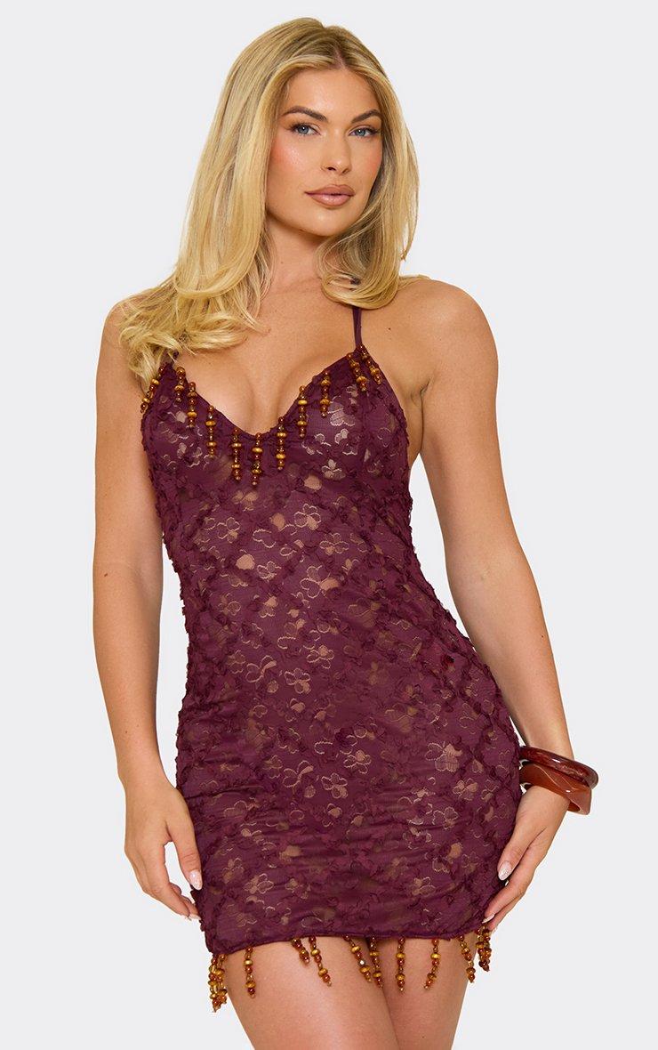 Serve fierce vibes, doll! Featuring burgundy textured fabric with plunge neck and tassel hem detailing, this mini dress brings bold, chic energy perfect for standout nights.