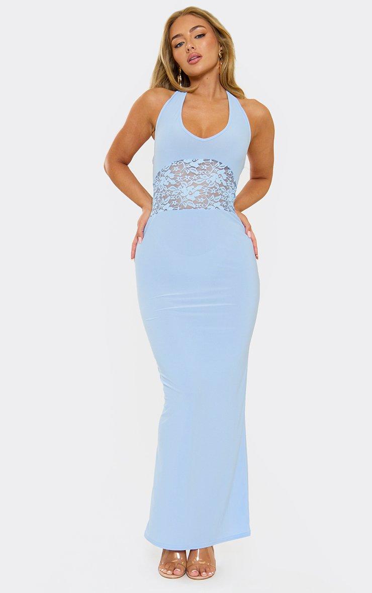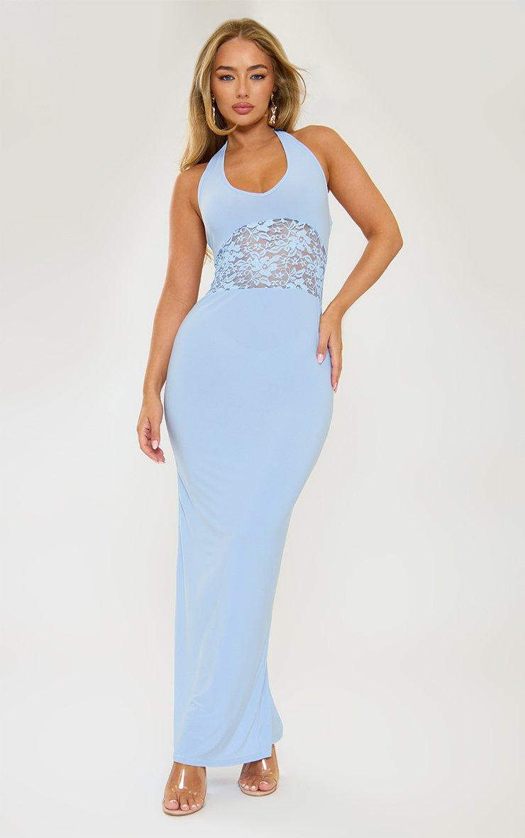 Plunge Lace Insert Detail Maxi Dress In Blue