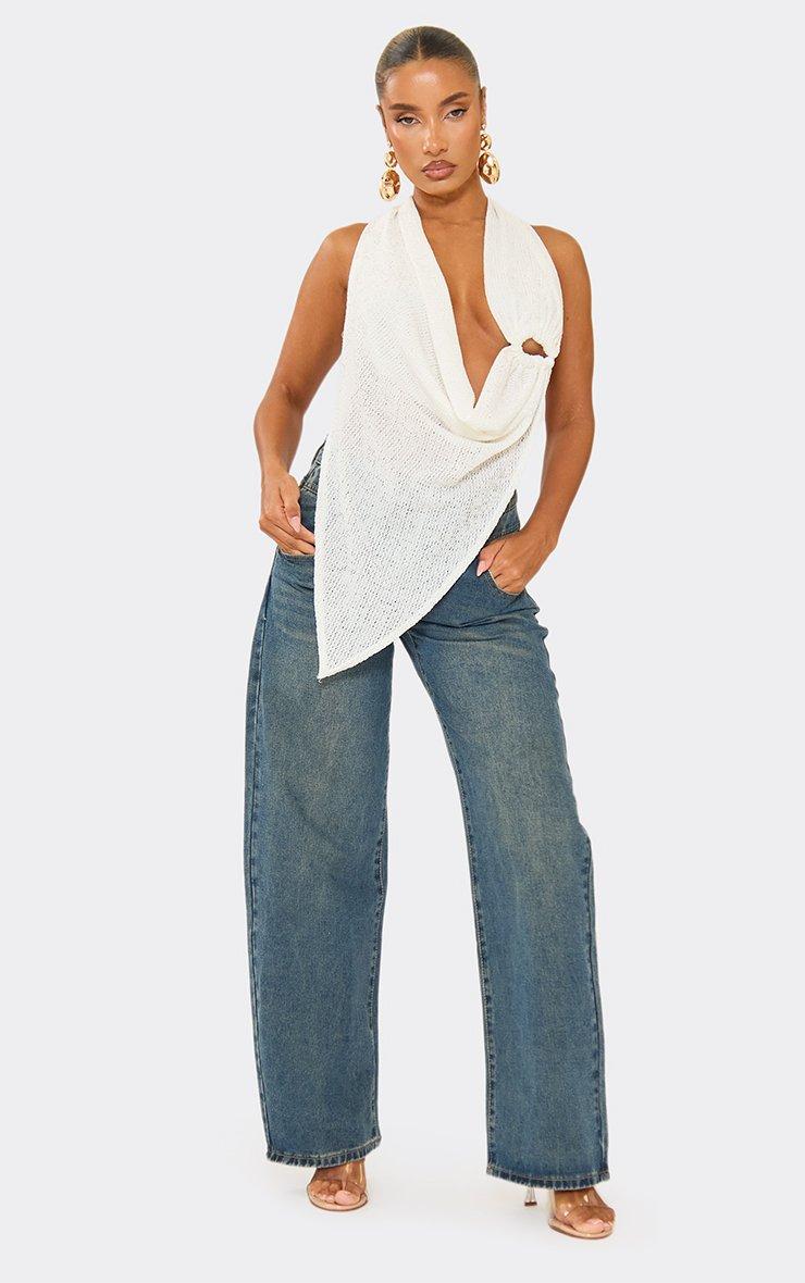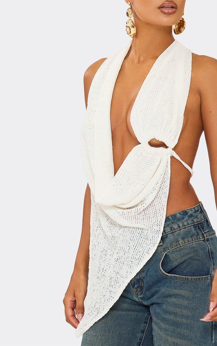 Turn up the chic in this white textured long top, featuring soft fabric with a plunge cowl neck and bold trim detailing. Perfect for dolls who serve fresh, bold vibes with effortless style.