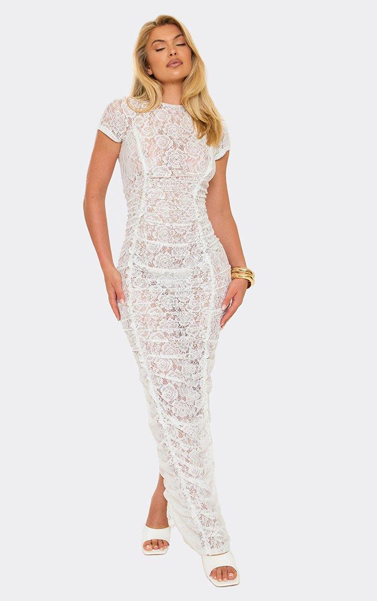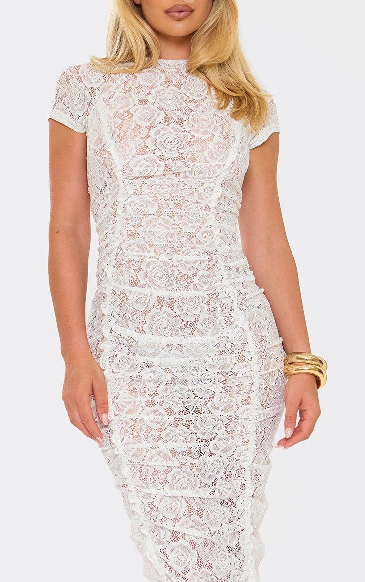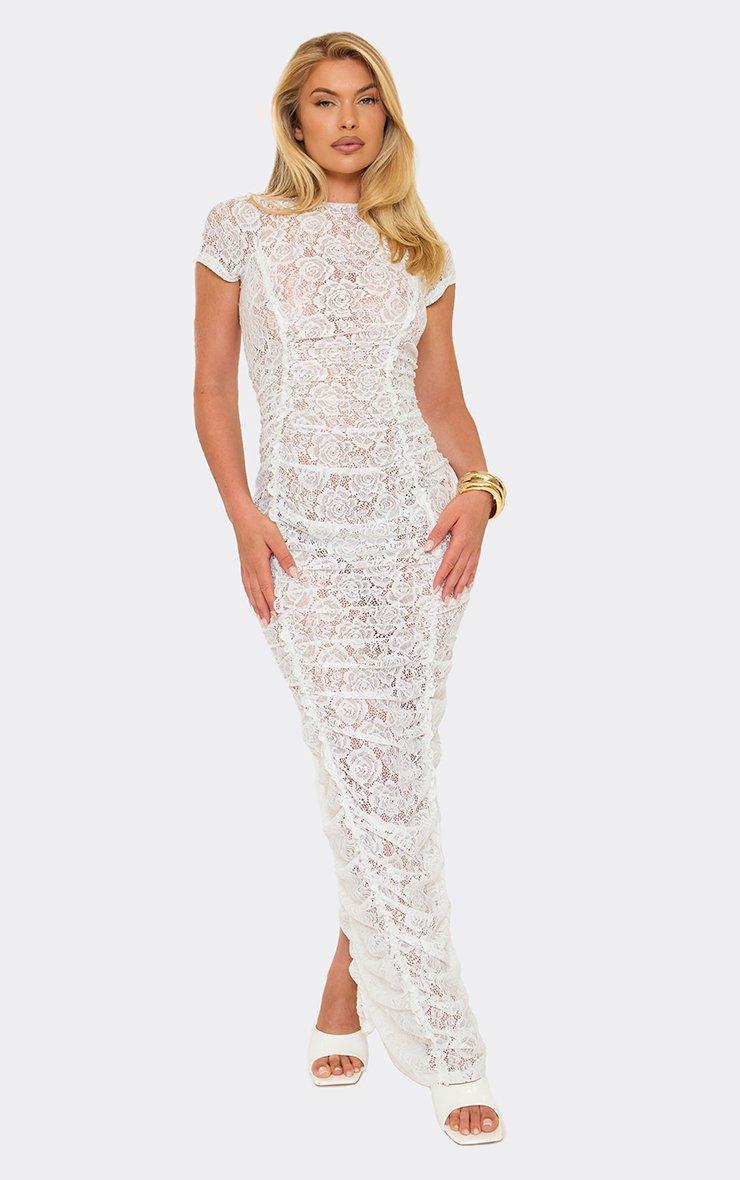 High Neck Short Sleeve Ruched Maxi Dress In White Lace