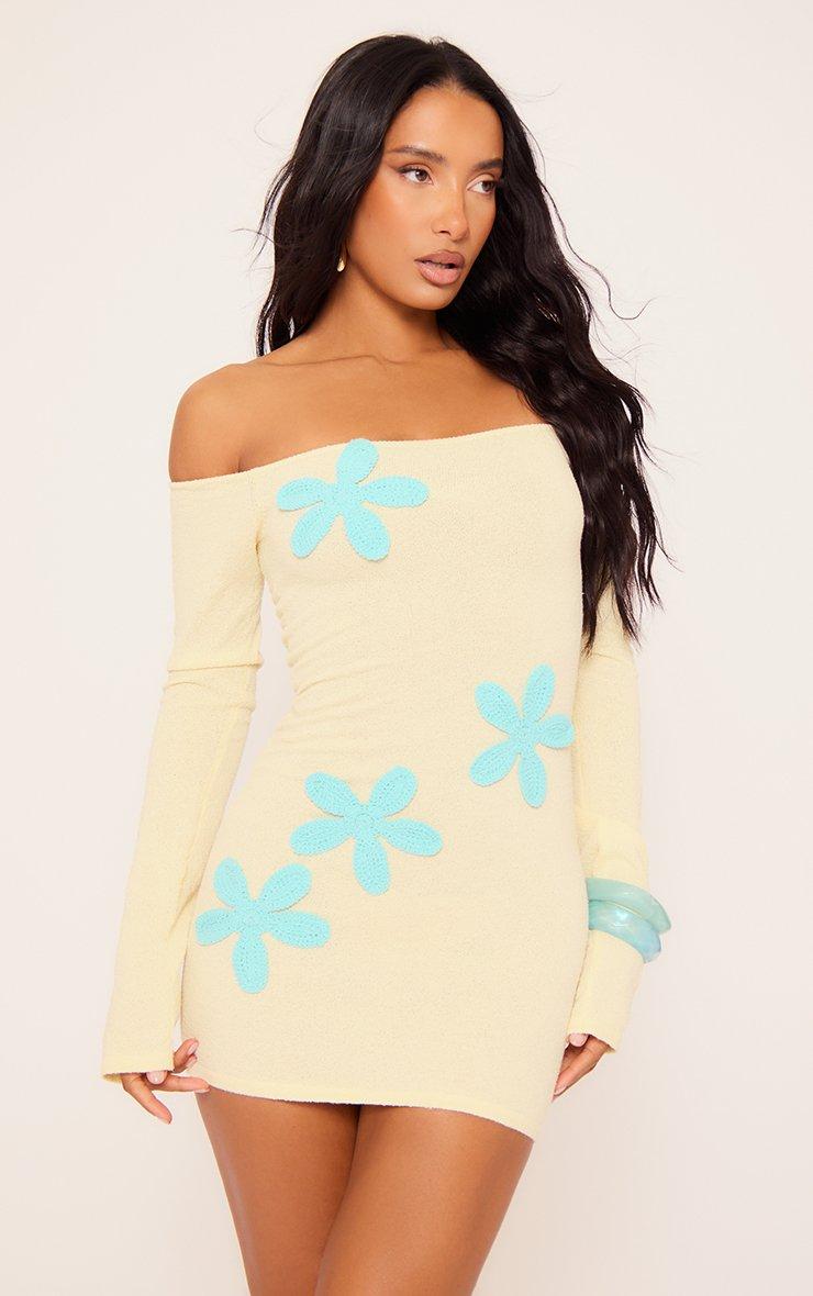 Off The Shoulder Flower Detail Mini Dress In Yellow Knit