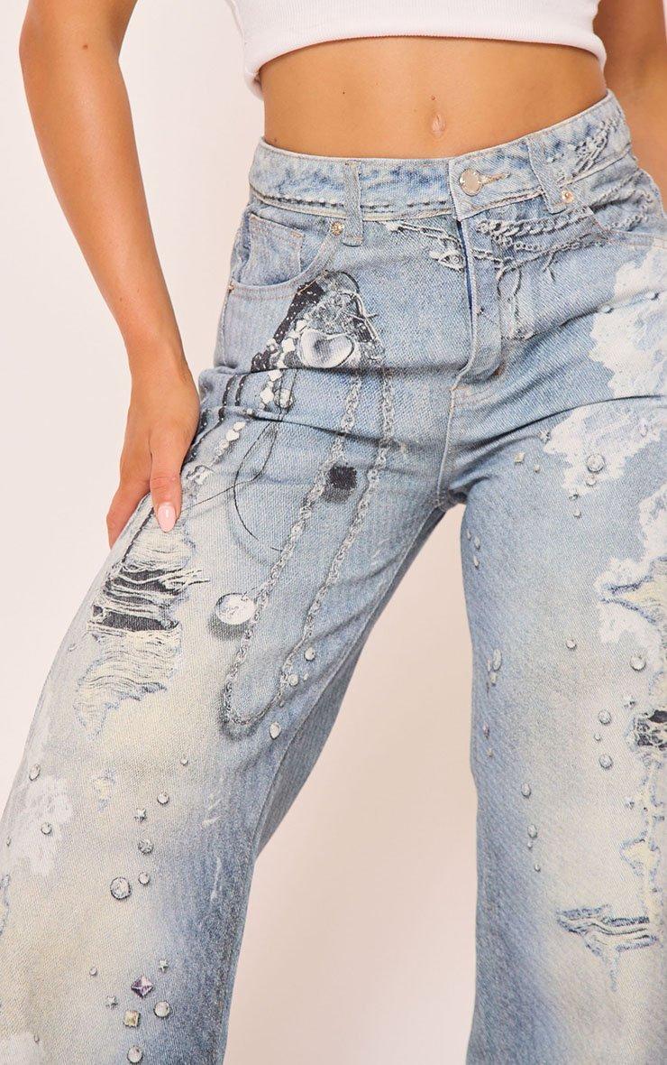 Weekend vibes, doll! Featuring blue denim with mid-rise fit and wide leg silhouette, plus distressed print detailing, these jeans bring bold, chill energy perfect for laid-back looks with attitude.