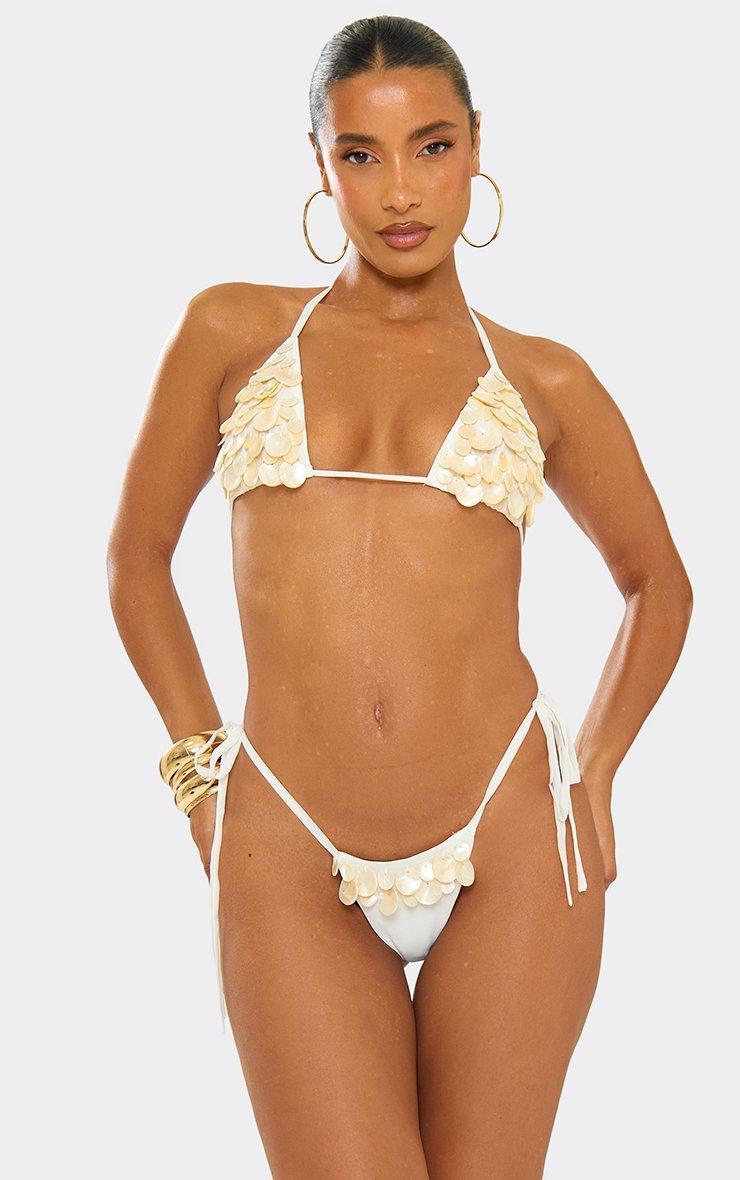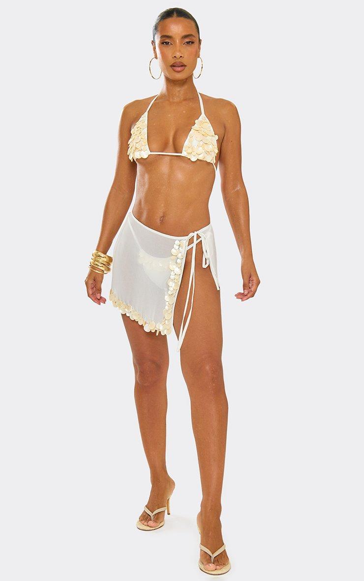 Tringle Shell Embellished Bikini Set And Wrap Mini Skirt In White