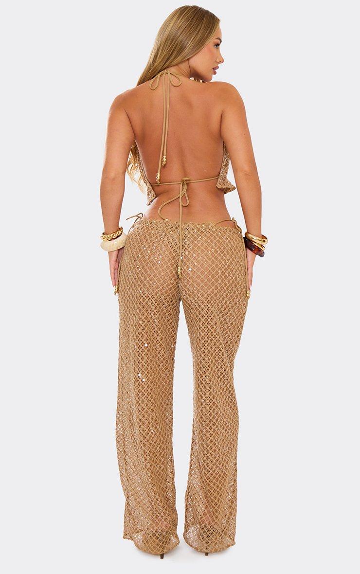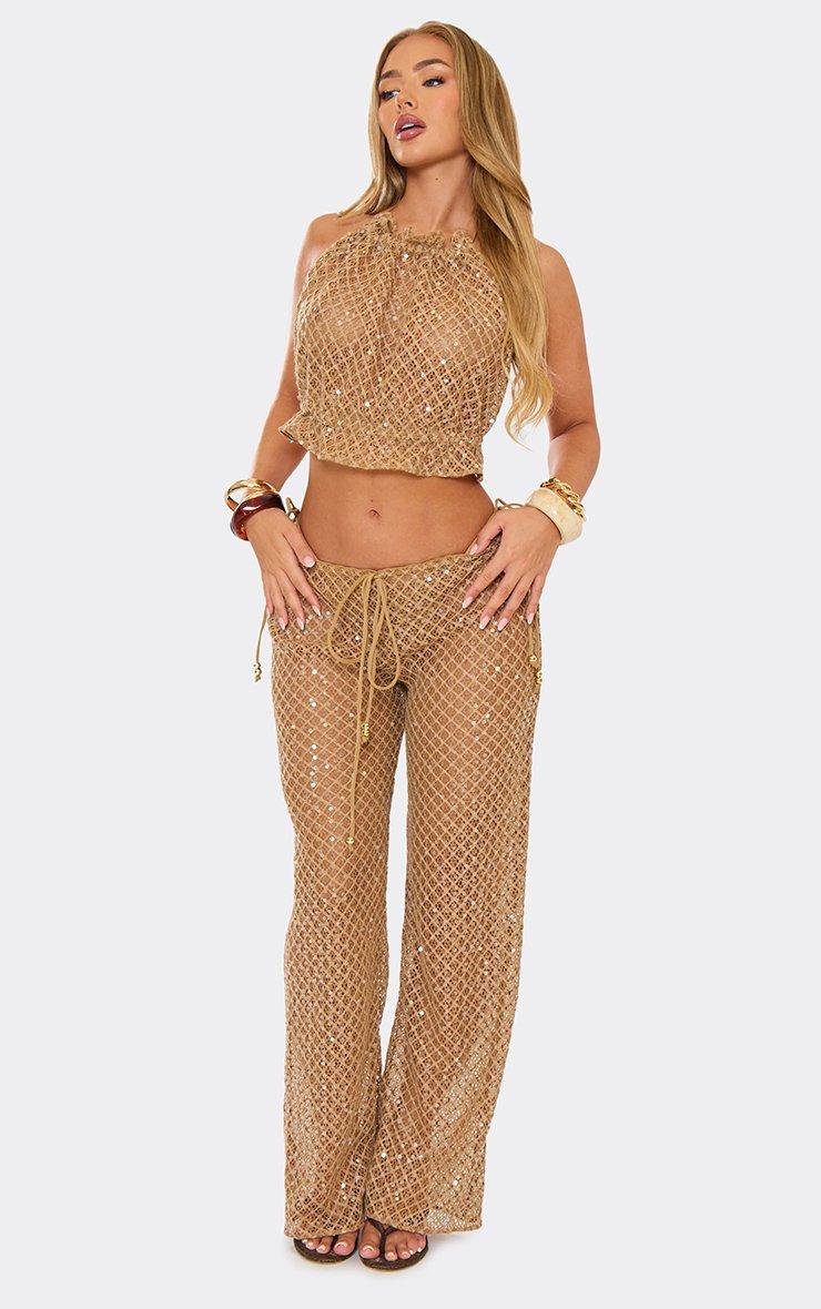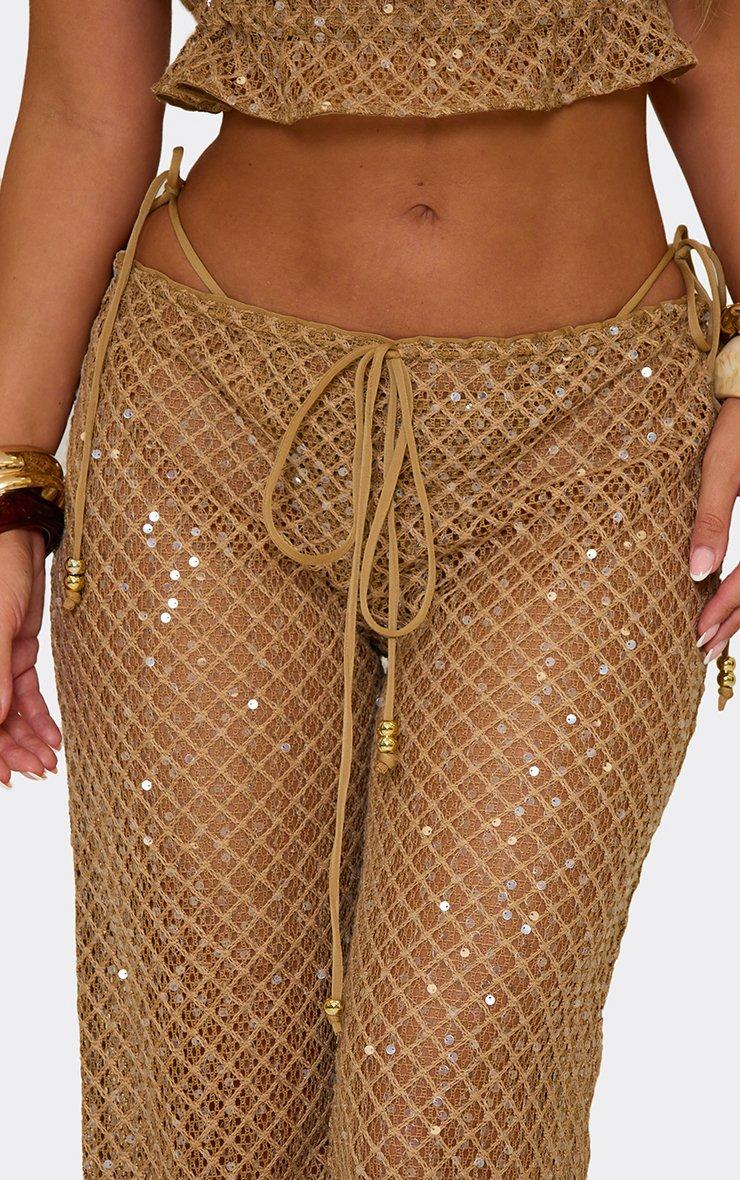 Crafted from brown textured sequin material with a tie waist and bead detailing, these straight leg trousers bring that chic, statement vibe perfect for standing out, doll.
