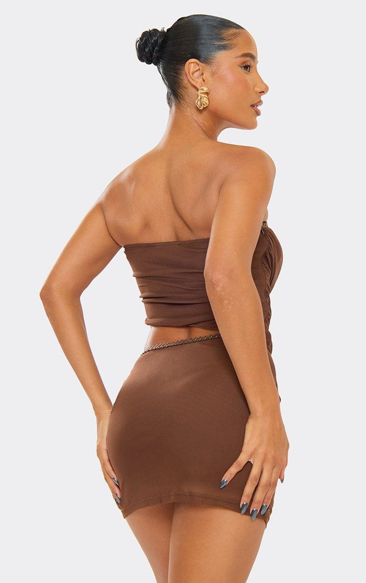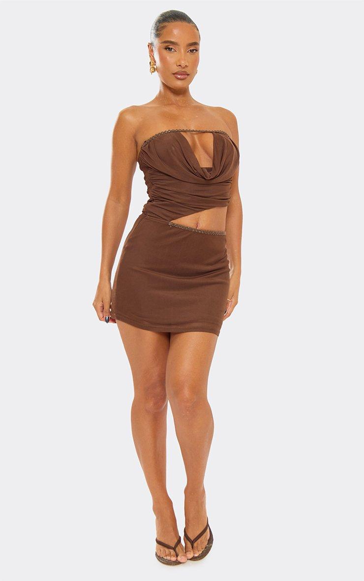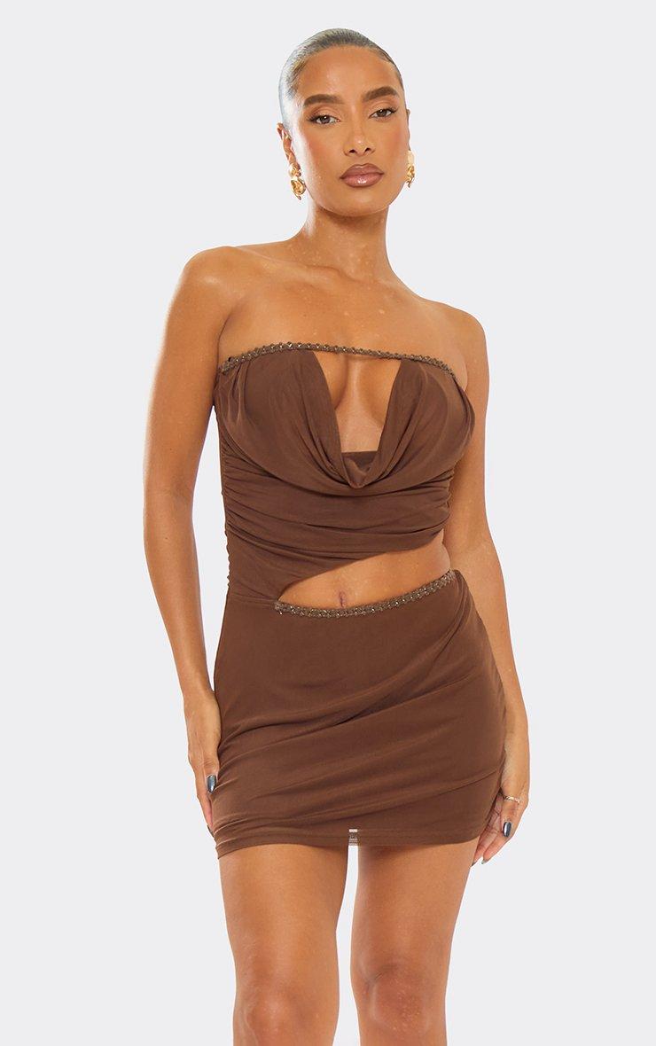 Bandeau Trim Cut Out Detail Mini Dress In Chocolate Brown Mesh