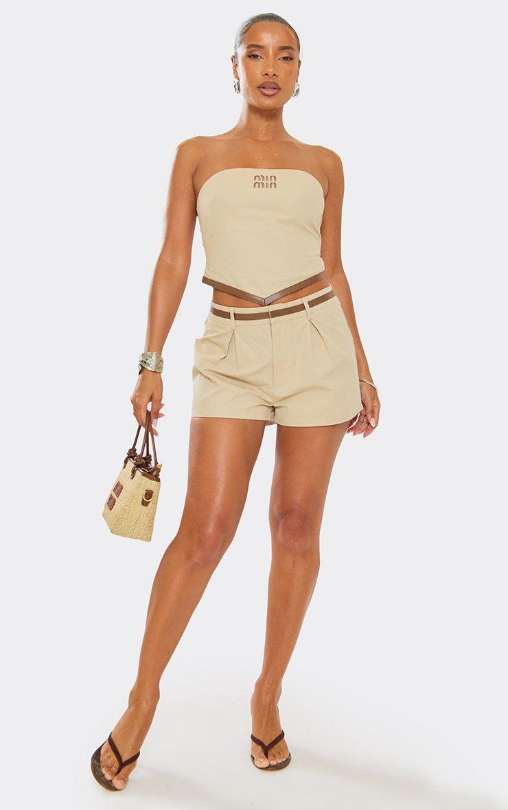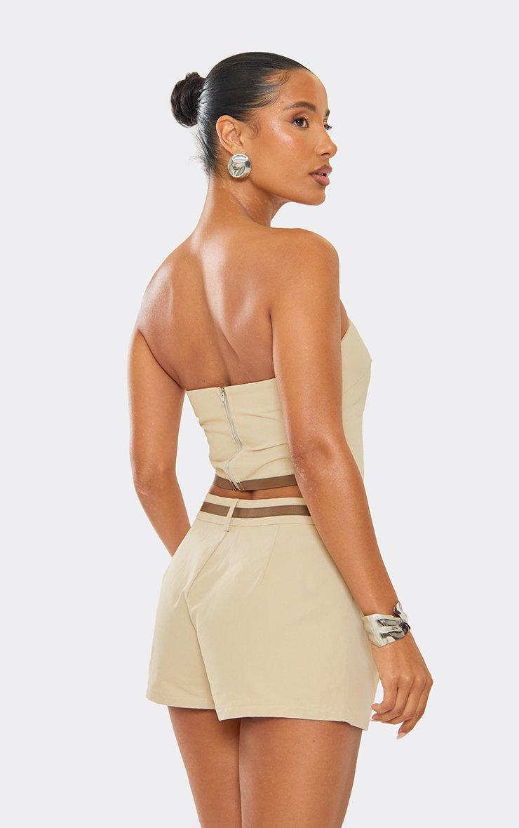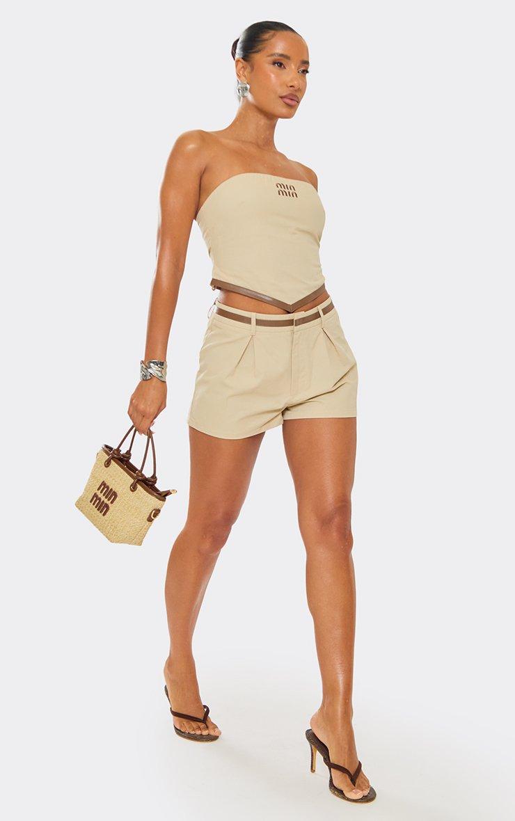 Mid Rise Faux Leather Trim Tailored Shorts In Stone