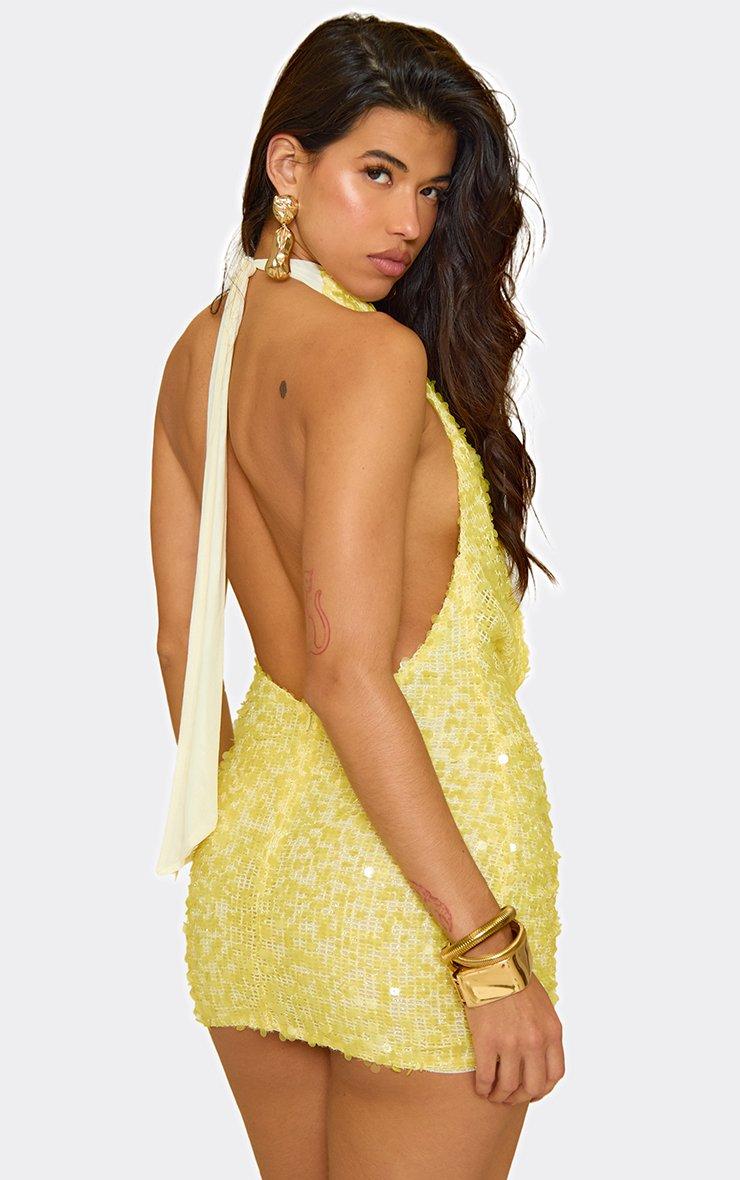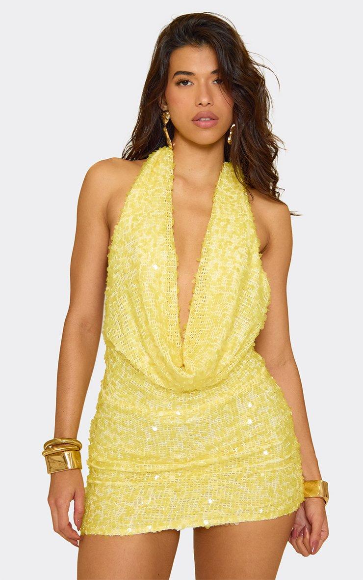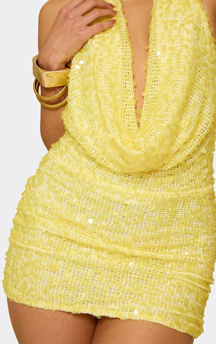 Cowl Neck Open Back Mini Dress In Yellow Fishnet Sequin