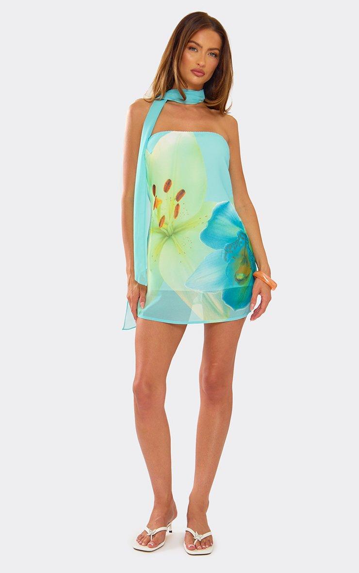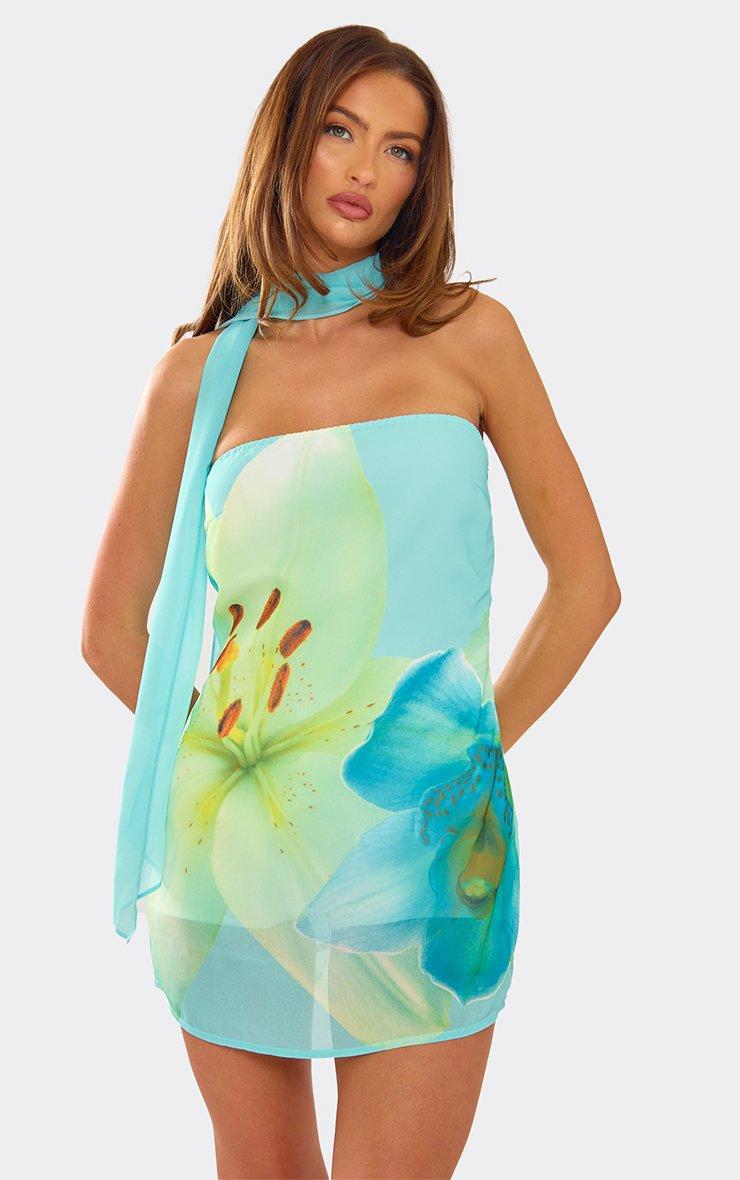 Bandeau Scarf Neck Detail Floaty Playsuit In Blue Floral Print