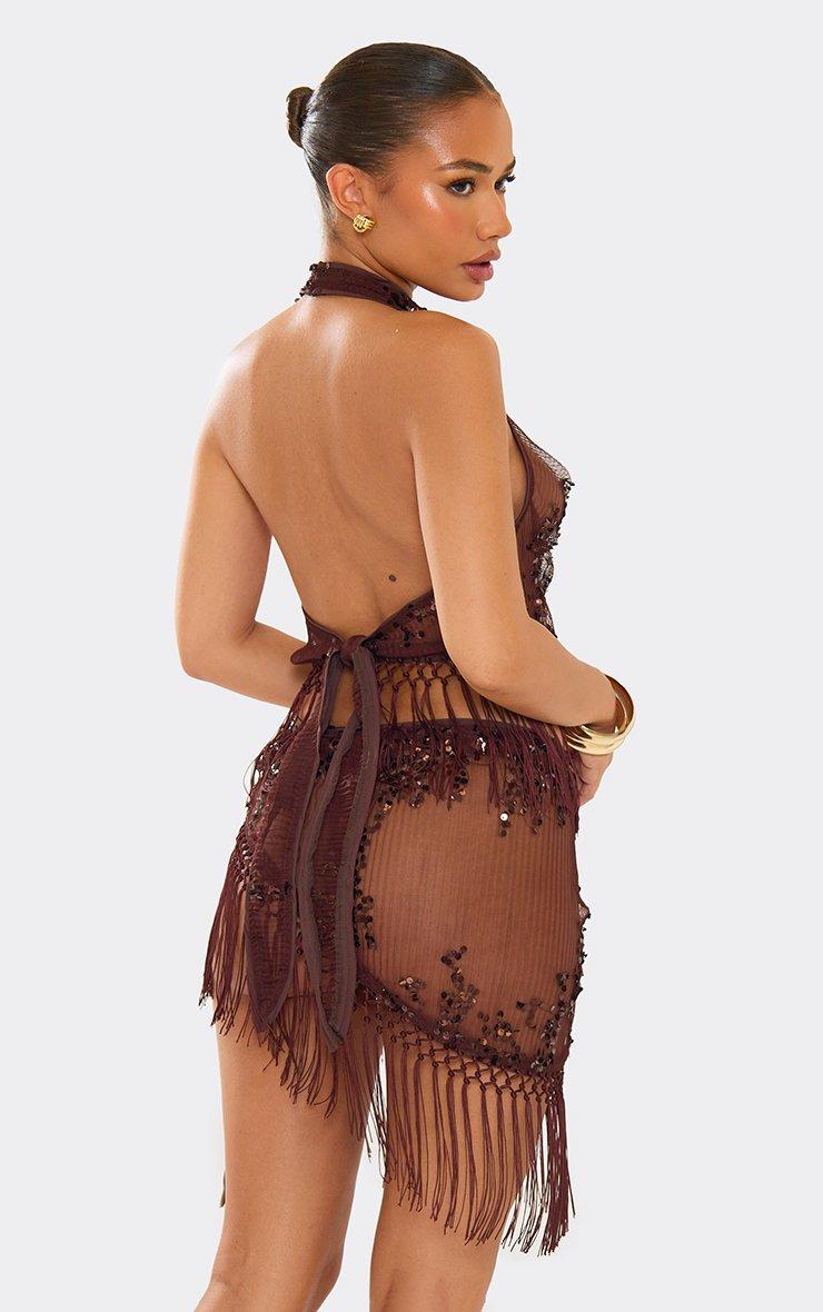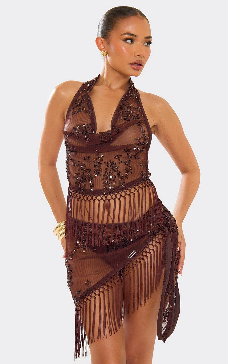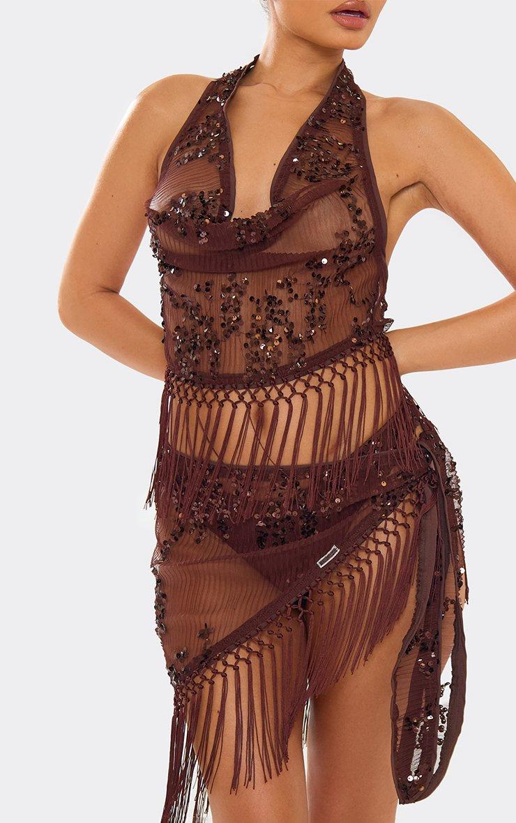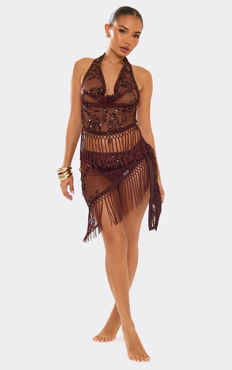 Serve shimmering vibes, doll! Featuring rich brown sequin fabric with tie side and tassel trim detailing, this sarong set brings bold, chic energy perfect for standout beach days and nights.
