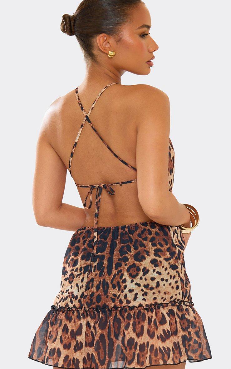 Choker Neckline Cut Out Frill Hem Detail Mini Dress In Brown Leopard Print