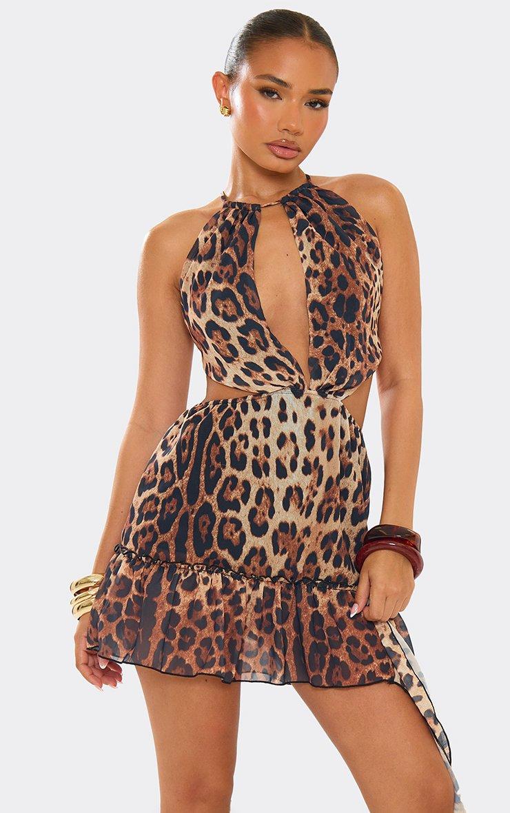 Unleash your wild side in this halterneck leopard print dress. Fierce and flirty, this mini dress puts you in the weekend mood. Designed in a brown leopard print , it boasts a choker neckline and cut-out detail for a heart-racing look. Meanwhile, the frill hem adds sweetness and balances out the backless style of this halterneck leopard print dress. Searching for autumn going-out dresses? Style this printed dress with knee-high boots and chunky bracelets for a look that lets you strut into the new season with confidence. Designed to be bold, this halter-neck leopard print dress is impossible to ignore. Key Features Brown Leopard Print Chocker Neckline Cut Out Detail Frill Hem Mini Length