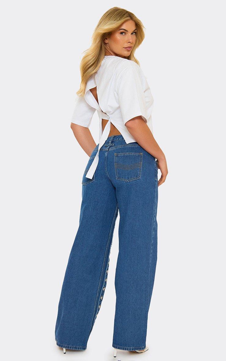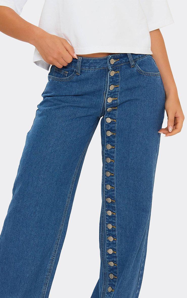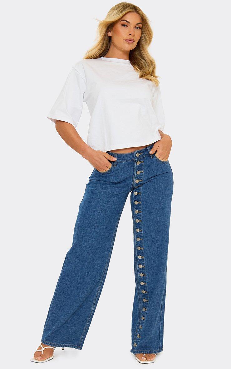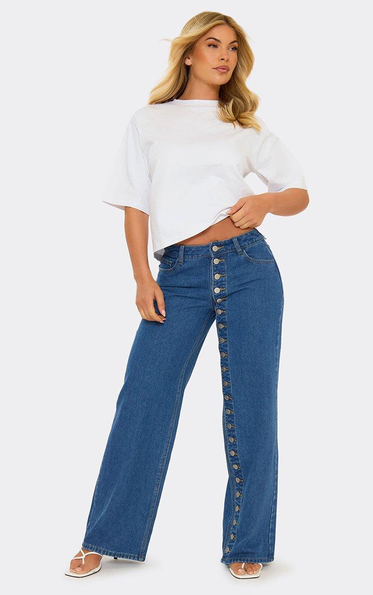 Casual-cool vibes, doll. Featuring mid blue wash denim material with button seam detailing and a low-rise boyfriend fit, these jeans bring effortless it-girl energy. Style with a crop top and trainers for a laidback, on-trend finish.