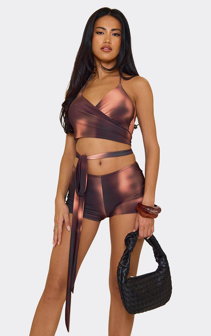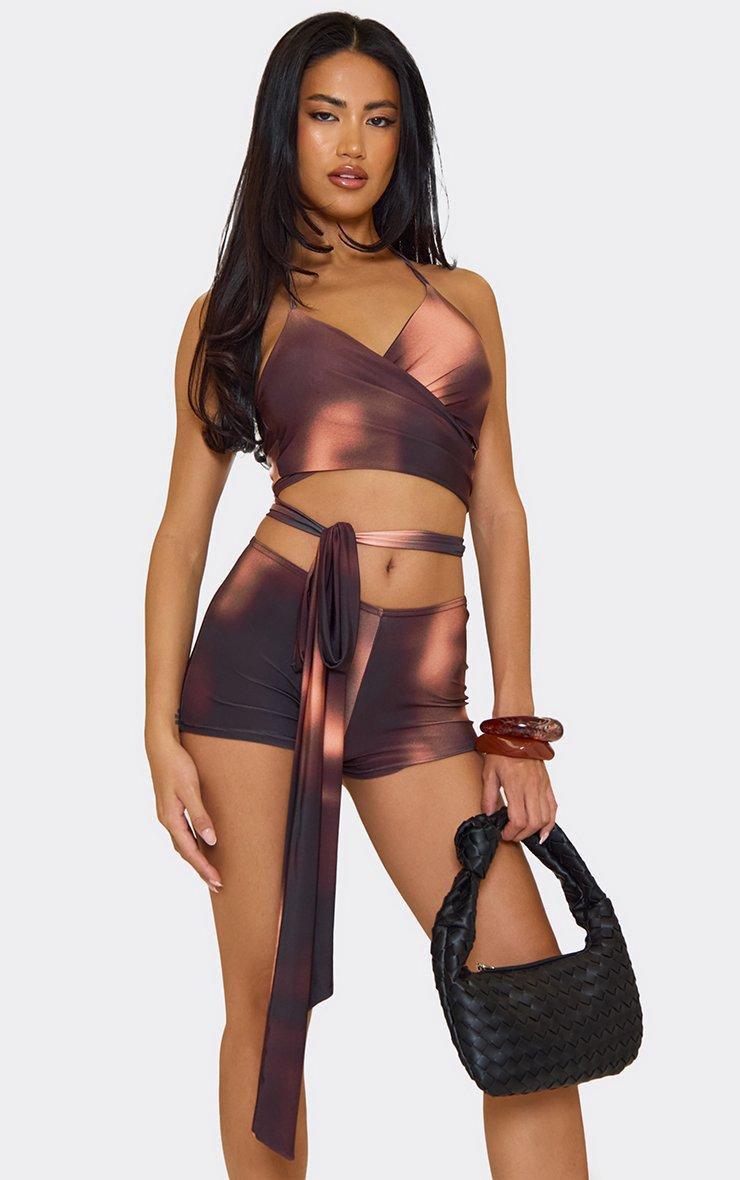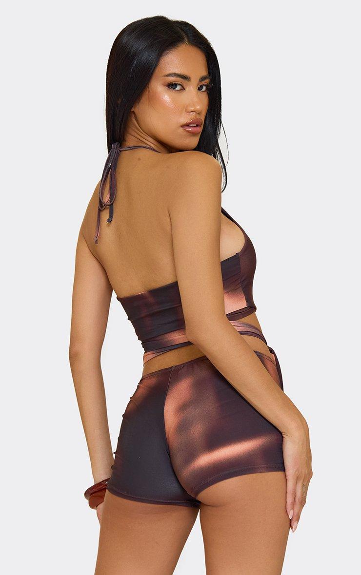Serve bold vibes, doll! Featuring brown printed slinky fabric, this crop top pops with strappy tie waist detailing for a fresh, chic finish full of attitude.