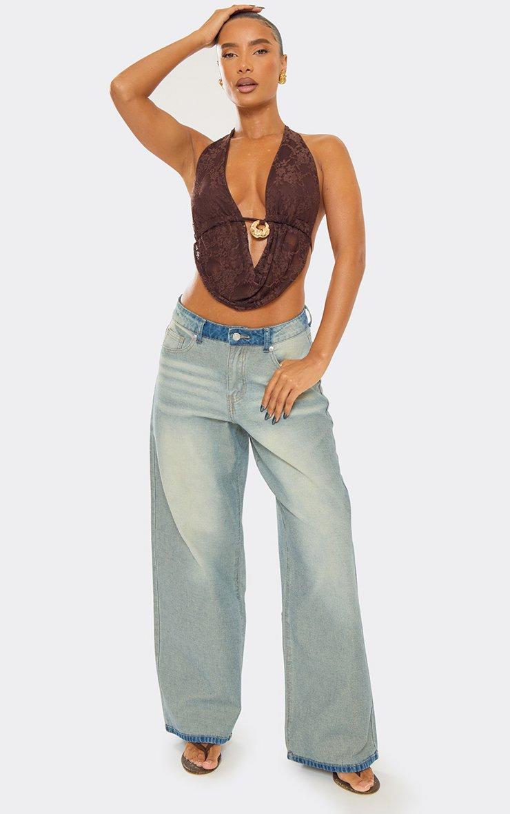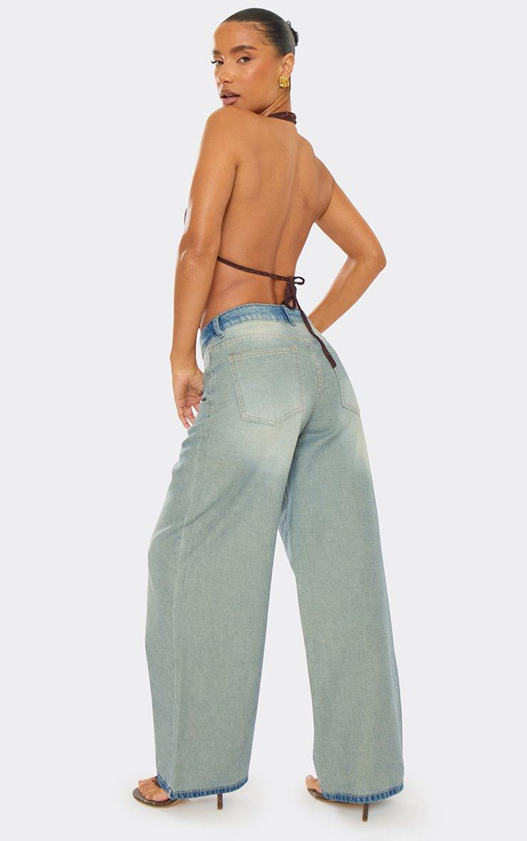 Mid Rise Washed Detail Wide Leg Jeans In Blue Denim