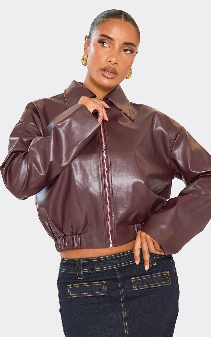 Long Sleeve Collared Detail Zip Down Bomber Jacket In Burgundy Faux Leather