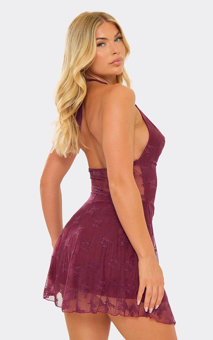 Rich burgundy red lace takes centre stage in this cowl neck skater dress, bringing a chic blend of romance and elegance with its effortlessly glam silhouette.