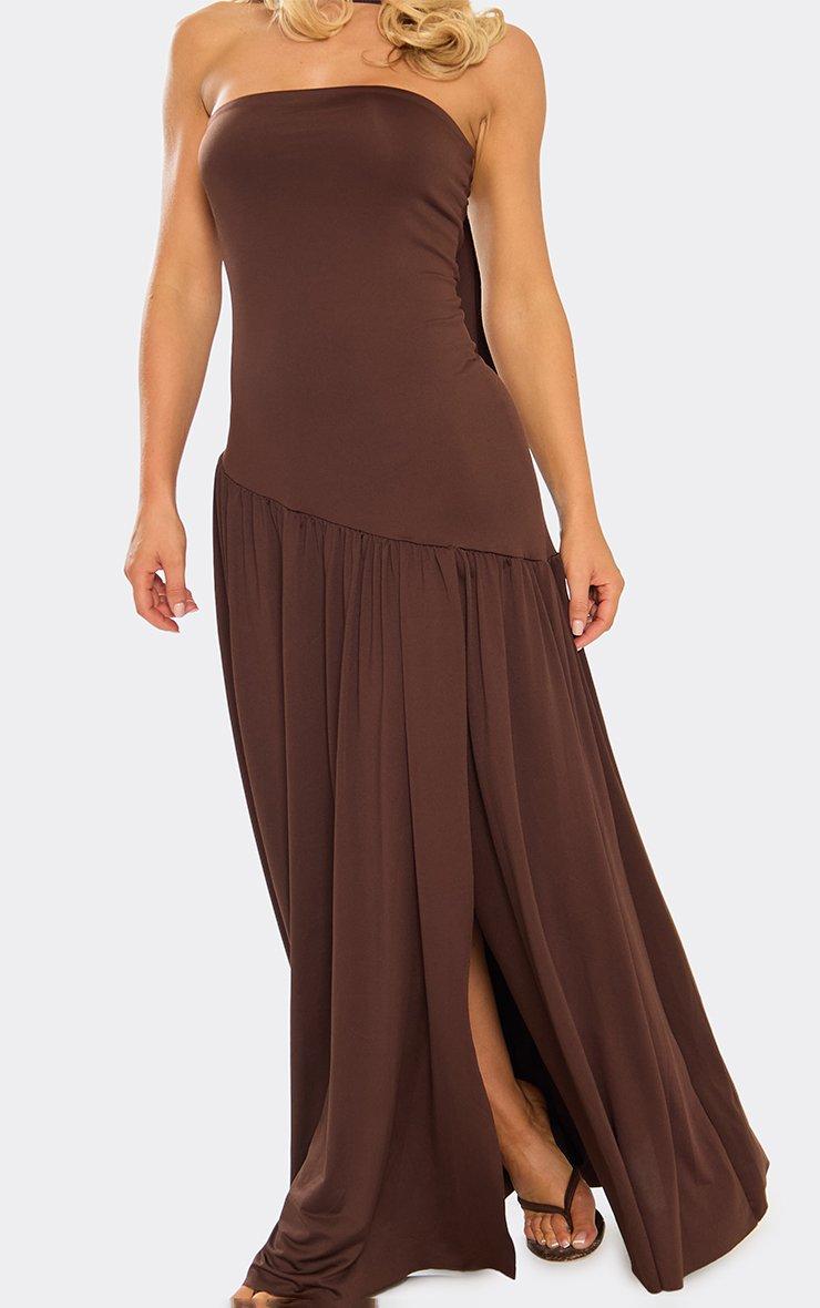 Hit the party, doll! Featuring chocolate brown fabric with bandeau and split leg detailing, this maxi dress wows with scarf accents for chic, bold vibes.