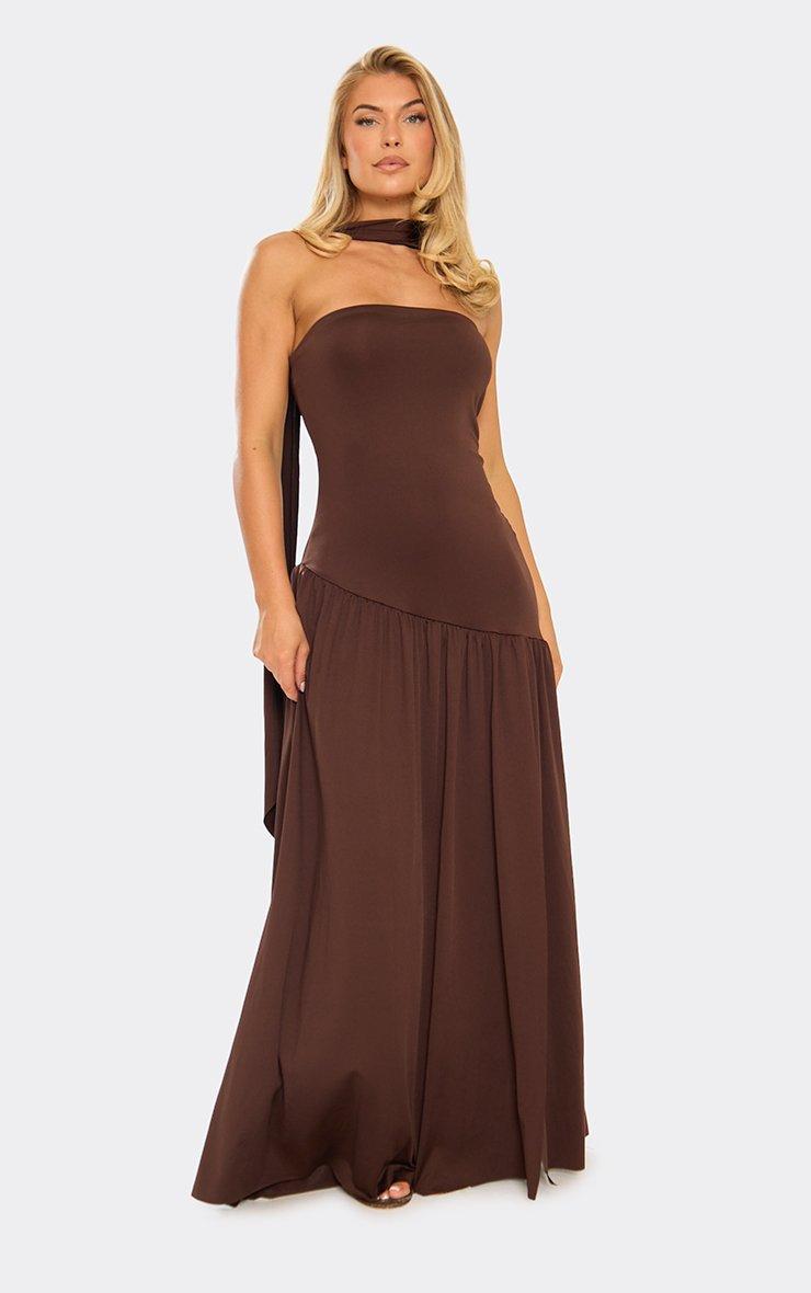Bandeau Split Leg Maxi Dress With Scarf In Chocolate Brown