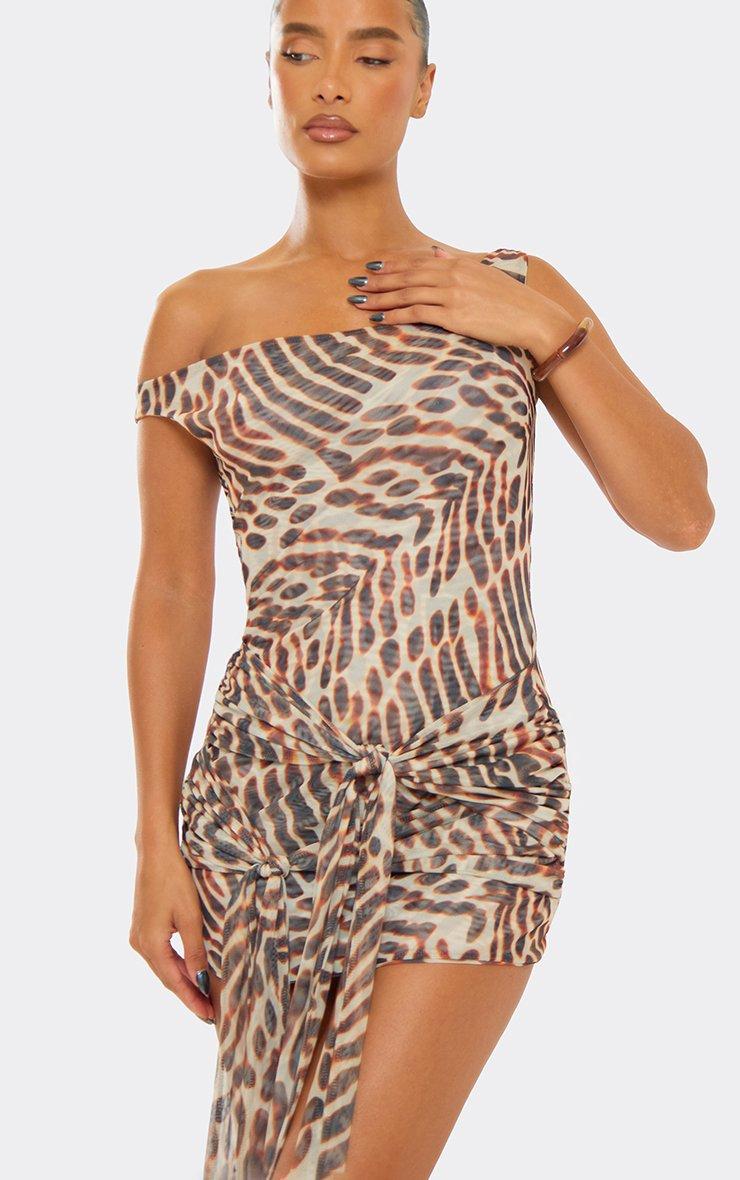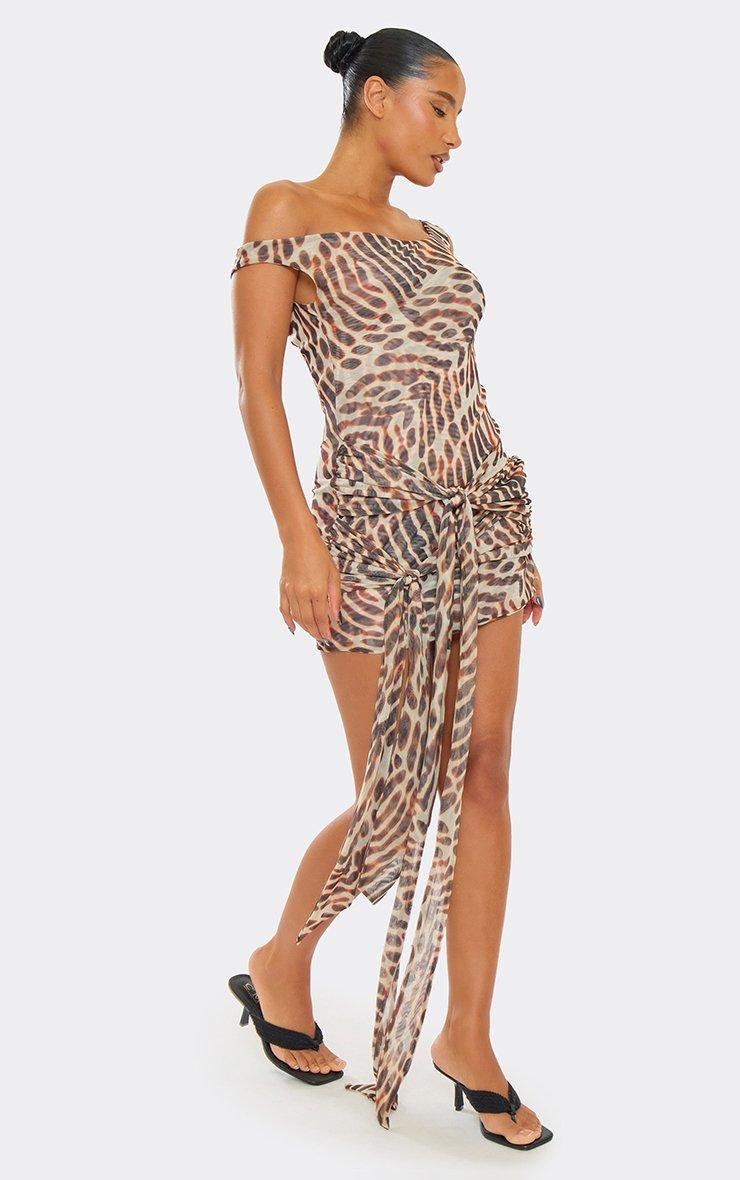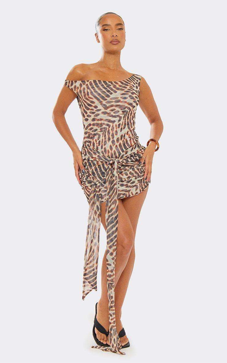 Asymmetric Drape Shoulder Tie Front Detail Mini Dress In Brown Animal Print