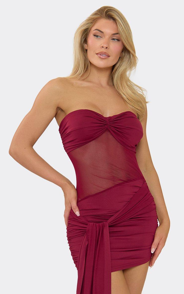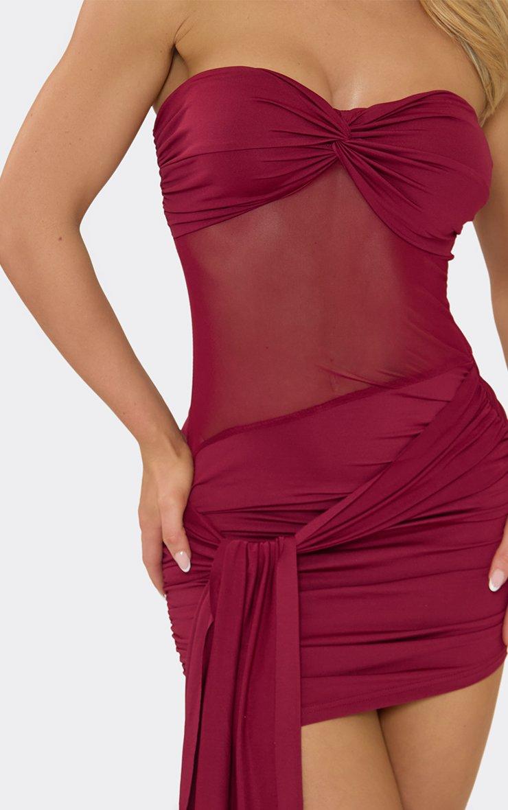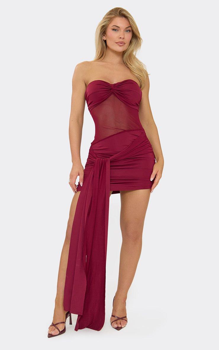 Perfect for night-out plans or statement vibes, burgundy fabric with bandeau neckline, twist front, and drape detailing for a sleek, on-trend mini fit. Style with strappy heels and a statement bag for effortless it-girl energy.